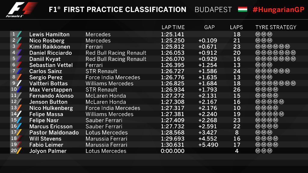 A 30. Forma-1-es Magyar Nagydíj első szabadedzésén egyértelműen a Force India-s Sergio Perez nagy balesete volt a legérdekesebb történés, ugyanis az eredmények tekintetében nagyjából a papírforma érvényesült.