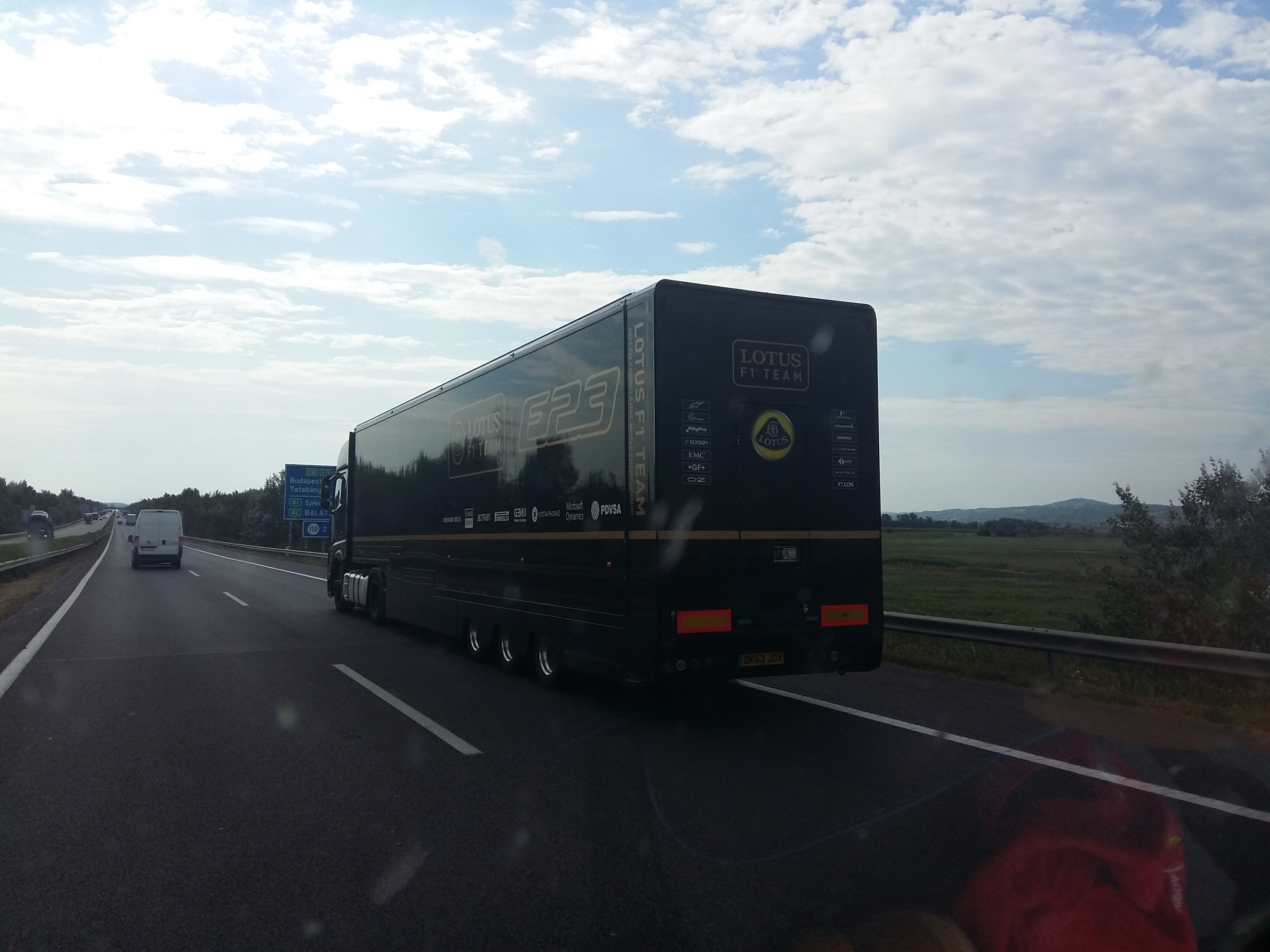 Egy másik olvasónk is szerencsés volt hétfőn, és a felhívásnak megfelelően küldött is F1-es találkozást dokumentáló képet – ő a Lotus-csapat szerszám-, alkatrész- vagy autószállító teherautójába futott bele szintén az M1-esen, íme: