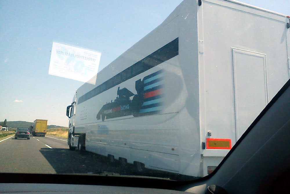 Egy harmadik olvasónk az M0-son botlott bele egy F1-es brigádba: “Mi a Toro Rossóval tankoltunk az Annahegyi pihenőnél” – írta. Mások “Bükfürdőről hazafelé” látták a Force India szállítógépét, később pedig a Williams teherautóját is, utóbbit sikerült lekapni.
