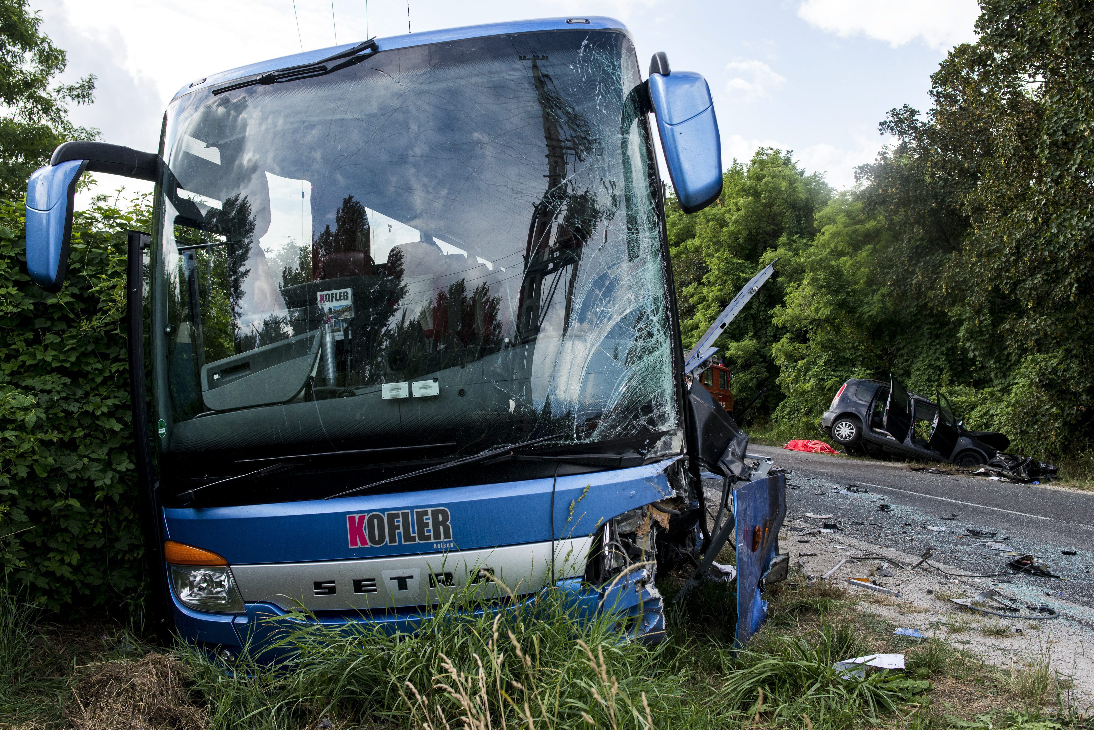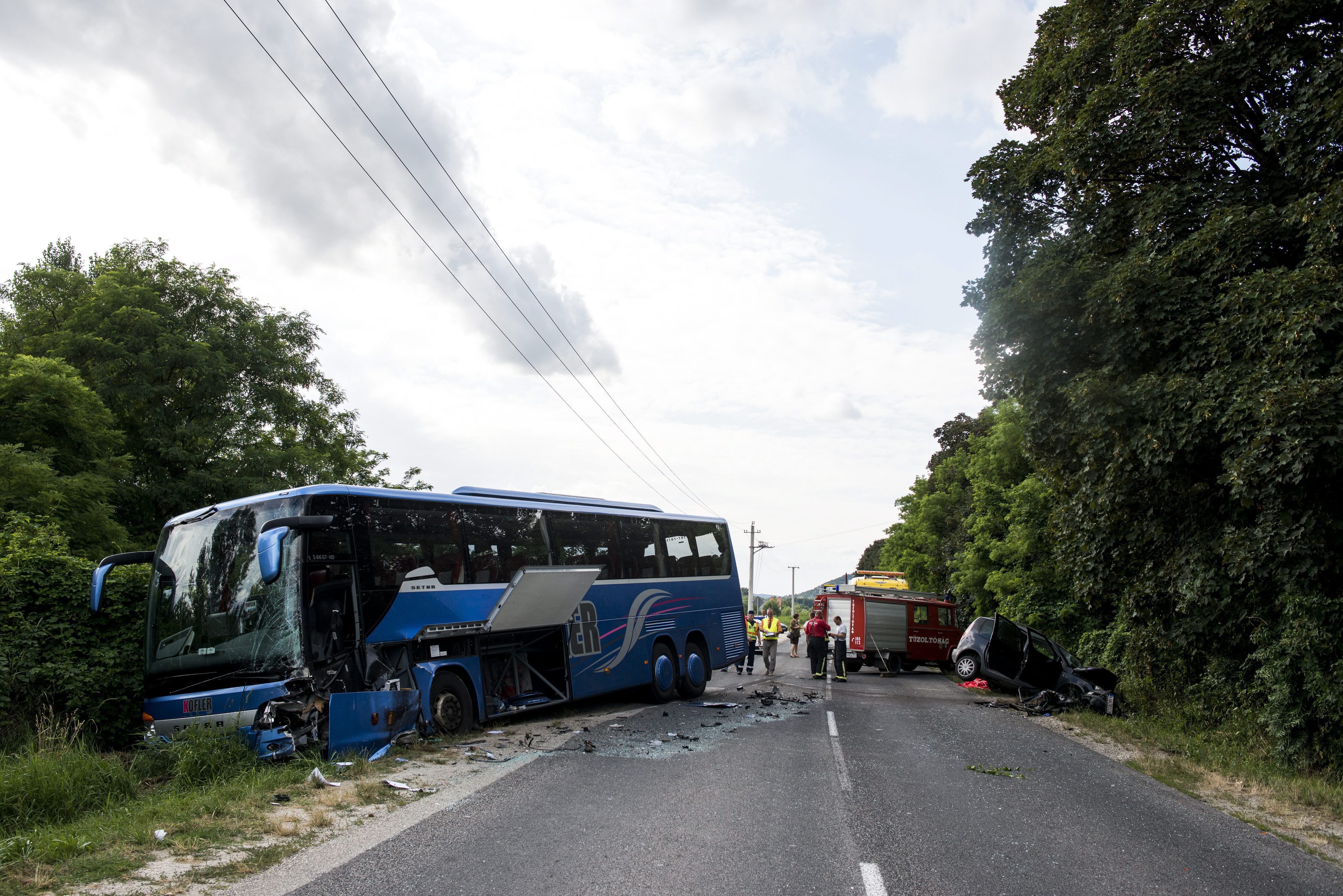 Az MTI úgy tudja, hogy egy német rendszámú turistabusz és egy szlovák rendszámú gépkocsi karambolozott. Az autó sofőrje beszorult a roncsba, megpróbálták újraéleszteni, de állapotát nem sikerült stabilizálni, a helyszínen meghalt. Női utasa könnyebben sérült.