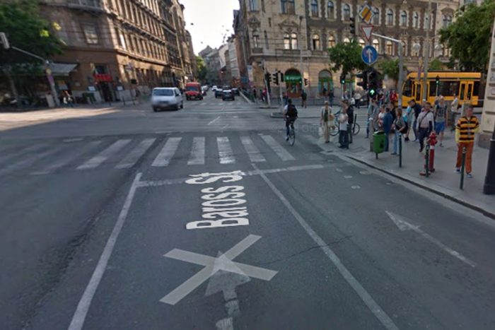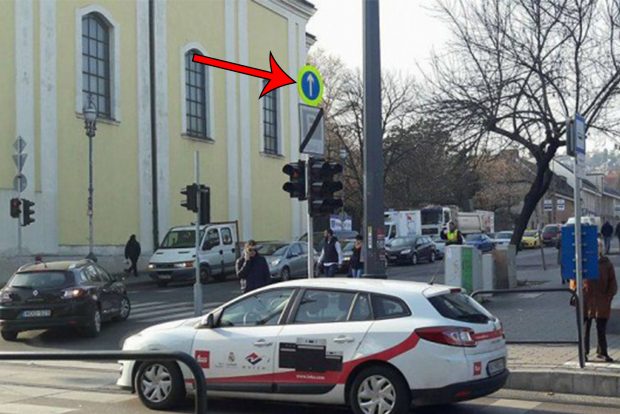 A lavinát elindító kereszteződés. Feltűnő színű háttérrel tették ki a Kötelező haladási irány táblát a Szépvölgyire felkanyarodni szándékozók tájékoztatására, bár éppen lehetett volna alacsonyabbra is. Pár hete már nem bírságolnak itt, amit sajnos kihasználnak egyes autósok – ez sem jó megoldás