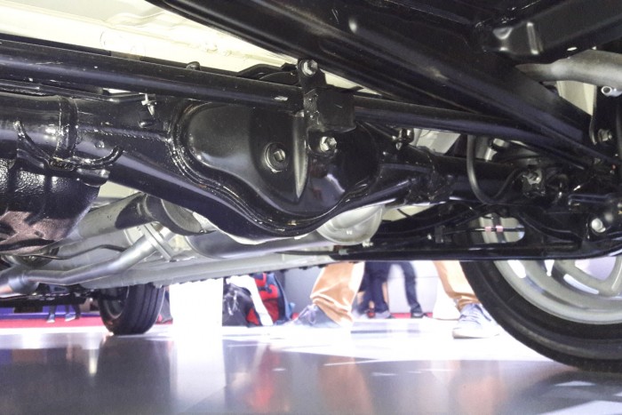 Én alámásztam a kiállított autónak és hátul terepjárós futómű-konstrukciót találtam a merev tengelyben futó féltengelyekkel, akárcsak a Jimnyben. Ez ne tévesszen meg senki, az új Suzuki Ignisnek semmi köze az alvázas, valóban terepjárásra tervezett Jimnyhez.