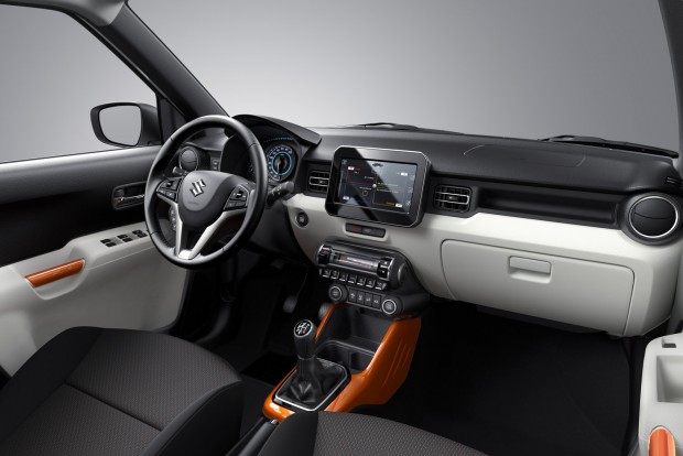 A nagy középső érintőképernyő a Vitaráéhoz hasonló menüvel működik, itt jelenik meg a tolatókamera képe és itt használható a navigáció is. Az okostelefon flott használatát segíti az AndroidAuto és az Apple CarPlay szoftvere valamint a képernyőtükrözés, amivel az autó kijelzőjén, szabálytalankodás nélkül vezérelhetjük az okostelefonon futó programokat. Belül az ajtóbehúzók és a középkonzol narancssárga díszítése sokat dob a látványon.
