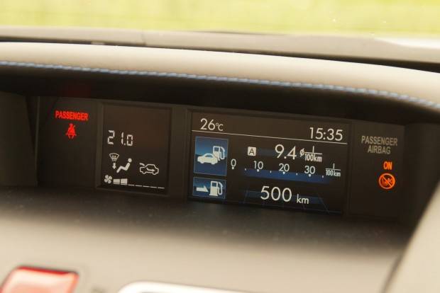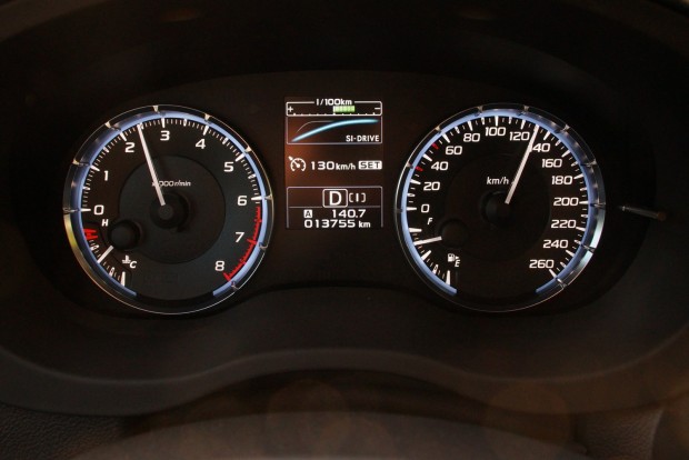 Az aktuális üzemmódot egy kis kijelző (az ötből) egy meredekebben illetve laposabban emelkedő grafikonnal illusztrálja is, de amit ténylegesen érezni lehet, annyi, hogy sportos üzemben kábé egy ezressel jobban pörög percenként a Subaru motorja.