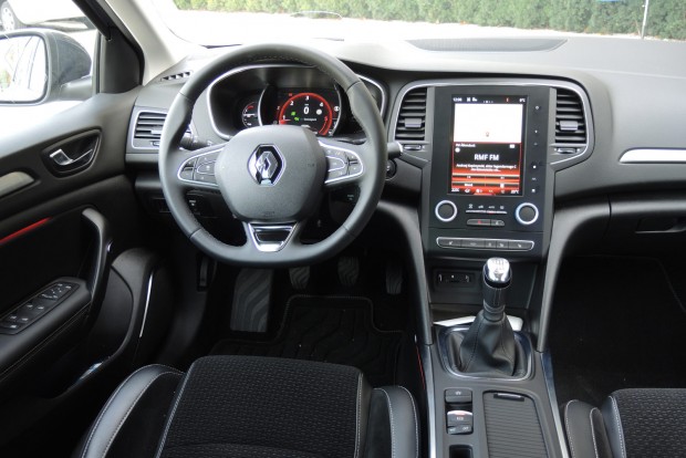 Természetesen belül is a többi Megane-ból megismert formák köszönnek vissza, ami mint tudjuk, sok azonosságot mutat a Talismanéval. Ennek megfelelően változtatható képű műszeregység néz szembe a sofőrrel, a középkonzolt pedig 8,7 colos érintőképernyő uralja. Ha ez nem volna elég, felárért headup-display is kerülhet a vezető elé. A központi képernyő menüje gyorsan tanulható, ám működését az teszi igazán jóvá, hogy nem mindent zsúfoltak bele, így vannak fontos gombok, amelyek mindig elérhetők és a klíma is valódi kapcsolókat kapott.