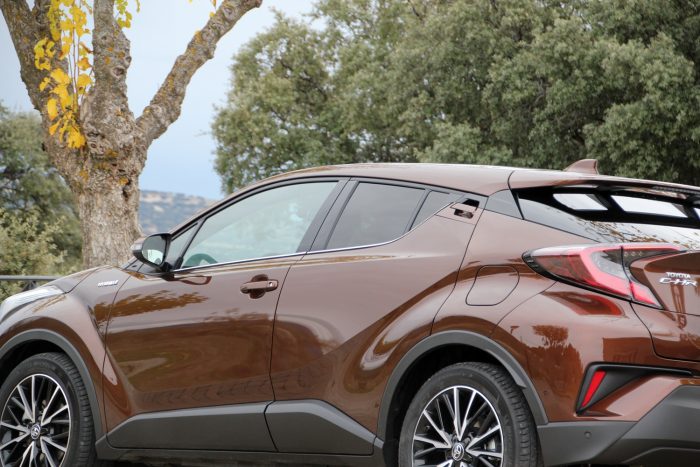 Kétféle motort kínál a Toyota a C-HR-hez. A belépő szinten 1,2 literes turbómotor és hat fokozatú kézi váltó jár az autóhoz, erről a kombinációról hamar kiderült, hogy messze nem a legjobb választás. A változatos domborzatú spanyol vidék kanyargós útjai alaposan megdolgoztatták az aprócska négyhengerest, 116 lóerős teljesítményéből és 185 Nm nyomatékából semmilyen módon nem lehet kellő dinamikát kifacsarni sűrű visszaváltások és padlón koppanó gázpedál közepette sem. Hiába képes takarékosabb Miller-ciklus (a feltöltős Atkinson) szerint is működni, a szerény dinamikához masszív fogyasztás társul.