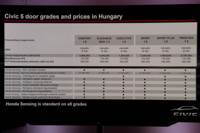 A márkarajongó magánvevők viszont elbüszkélkedhetnek majd a céges octaviás vagy focusos szomszédnak az alapáron járó példátlanul sok vezetéstámogató rendszerrel. A városi ütközéselkerülő automatikus vészfékezés, követőradaros tempomat, az önállóan kormányzó sávtartó automatika, a táblafelismerő az alapkivitel része, Honda Sensing a teljes rendszer neve. Ilyen szintű aktív biztonság gyakorlatilag talán a legnagyobb japán luxusautókon kívül semmilyen más alapmodellben nincs.