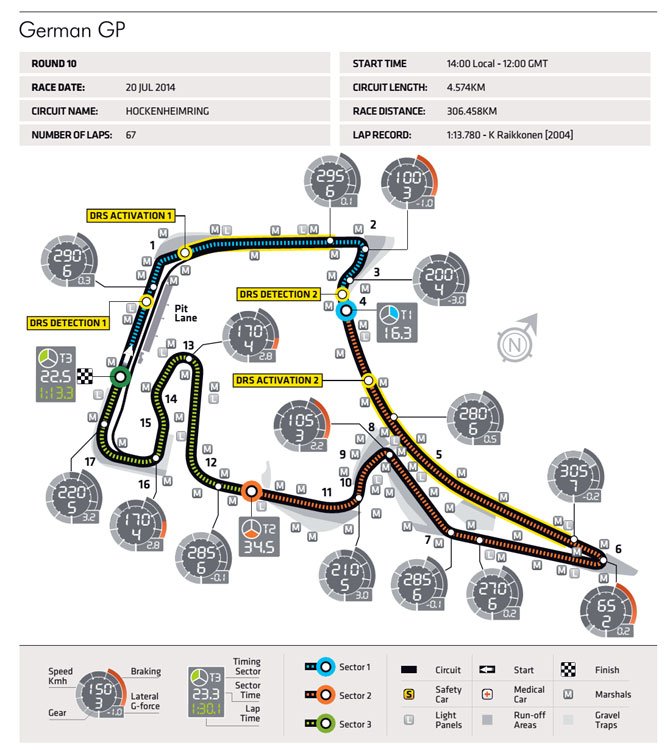 A Pirelli a Német Nagydíjra a kínálat két legtapadósabb keverékét, a lágyat (sárga) és a szuperlágyat (piros) viszi, persze a fentiek alapján vasárnap szükség lehet majd az esőgumikra is.
