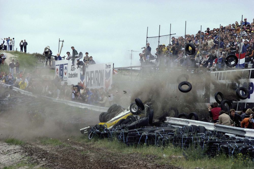 A lelátók nem véletlenül kerültek mára messze a pályától. Ez a kép jól bizonyítja az okokat. A Holland Nagydíjon 1982-ben készült fotó pont elkapta Rene Arnoux becsapódását a gumifalba. A Renault nagy sebességgel rongyolta szét az abroncsokat, de szerencsére senki sem sérült meg.