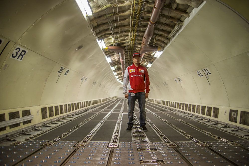 A Ferrari most ezt a két dolgot hozta össze a 2007-es Forma-1-es világbajnoknak, de a finn ezúttal talán nem bánta, ugyanis az olasz csapat egyik szponzora, a globális logisztikai cég, a UPS louisville-i légi szállítási központjában egy Boeing 757-es repülőgépen gyakorolt a hétvégi Amerikai Nagydíj előtt.