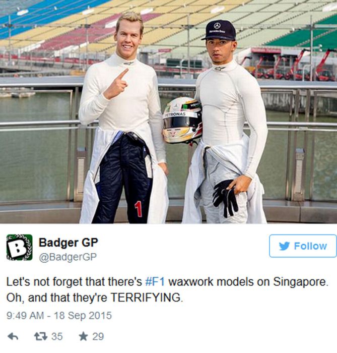 A Szingapúrban pénteken készült fotó a szombati időmérő után különösen érdekes: Vettel bábuja az egyes pozíciót mutatja boldogan, Hamilton “hasonmása” viszont egykedvű.