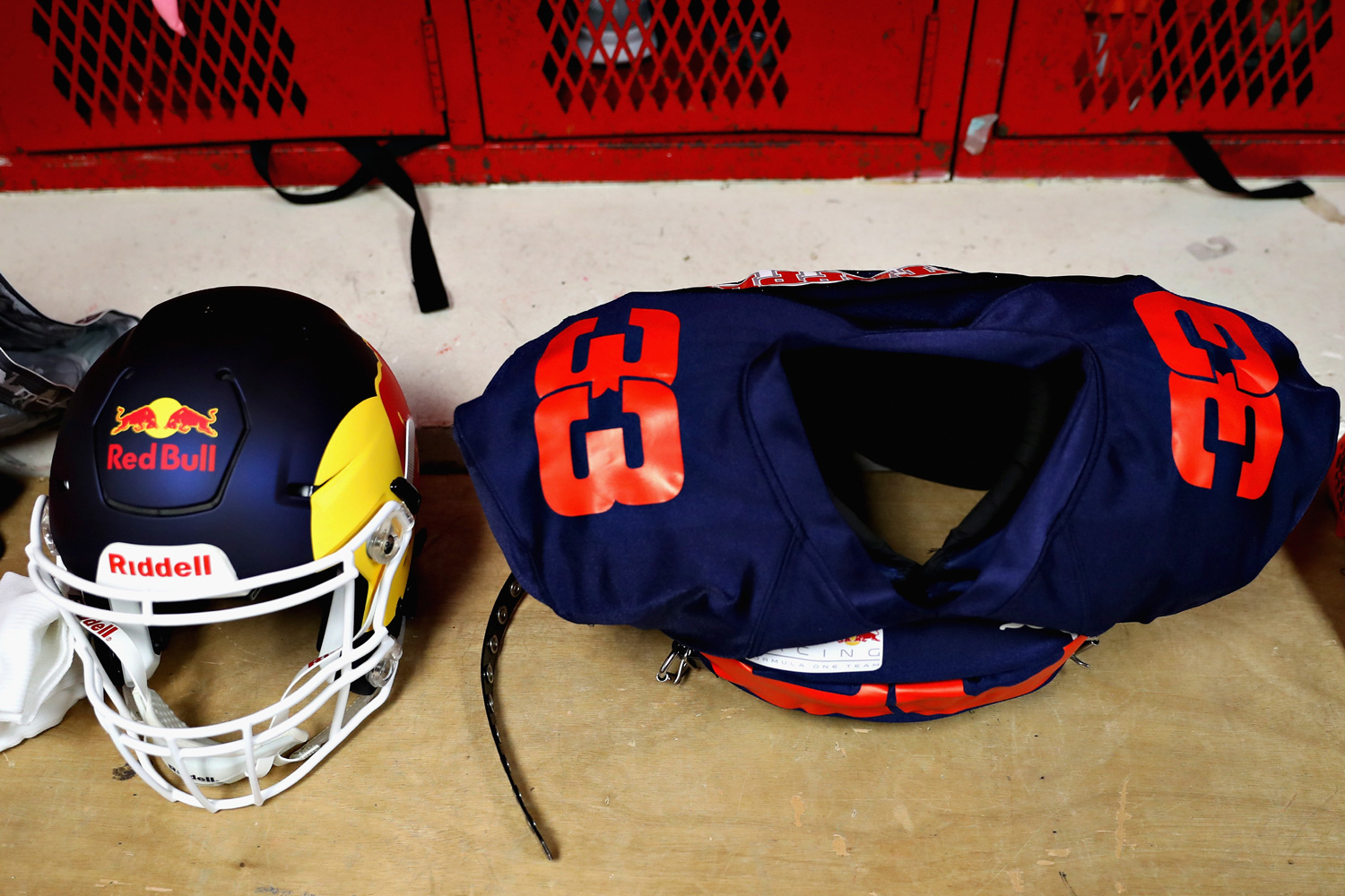 Az F1-es követelményeknek megfelelő sovány, szálkás alkatú Daniel Ricciardón és Max Verstappenen ugyan furán festett az amerikaifocis felszerelés, de szemmel láthatóan nagyon élvezték az élményt.