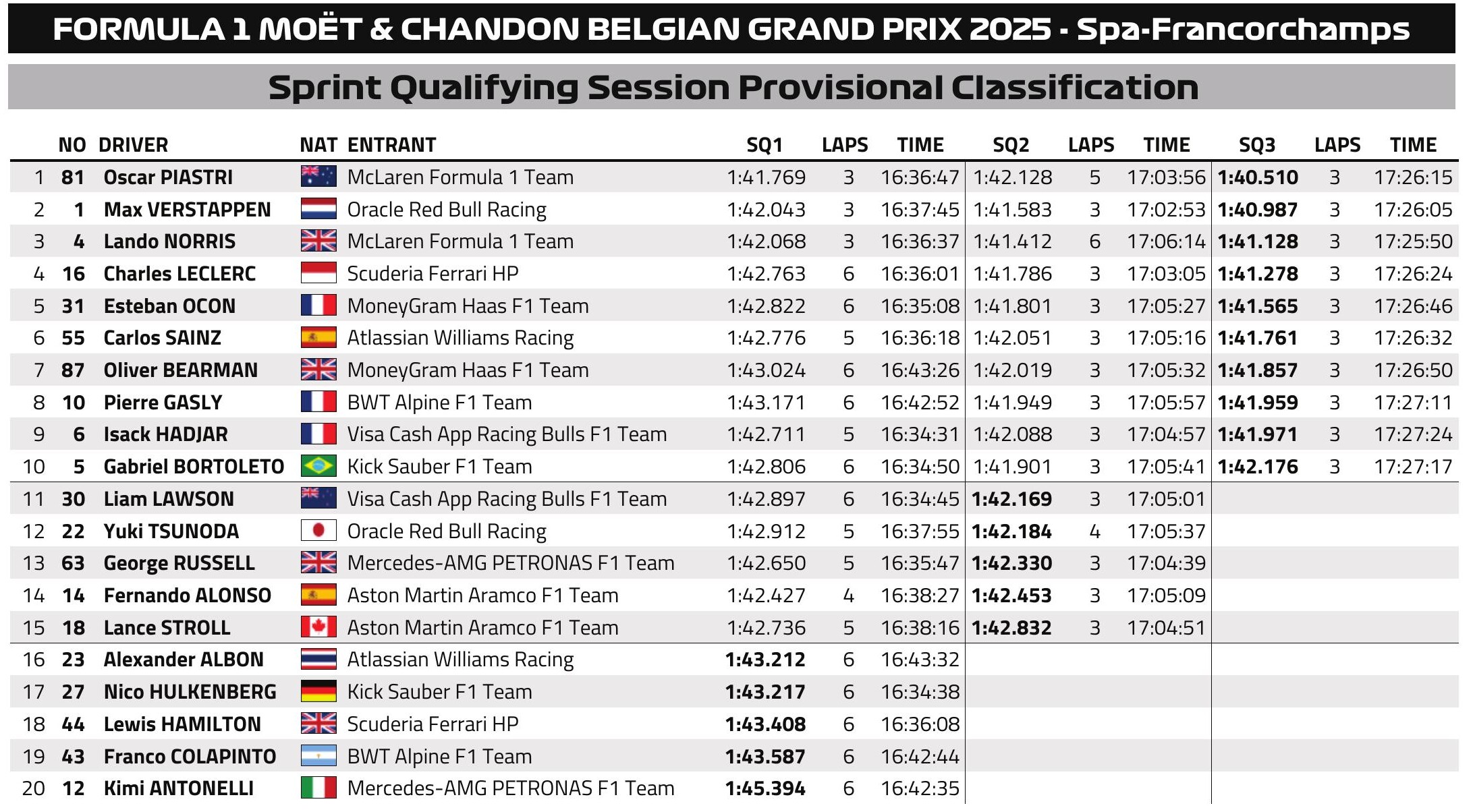 Péntek délután, napos időben, 22 Celsius-fokos levegő- és 37 fokos aszfalthőmérséklet mellett vette kezdetét a 2025-ös Forma-1-es Belga Nagydíj sprintidőmérője. Az egyetlen spa-i szabadedzésen Oscar Piastri kiemelkedett a mezőnyből, még saját csapattársát, Lando Norrist is fél másodperccel verte a McLaren-pilóta.