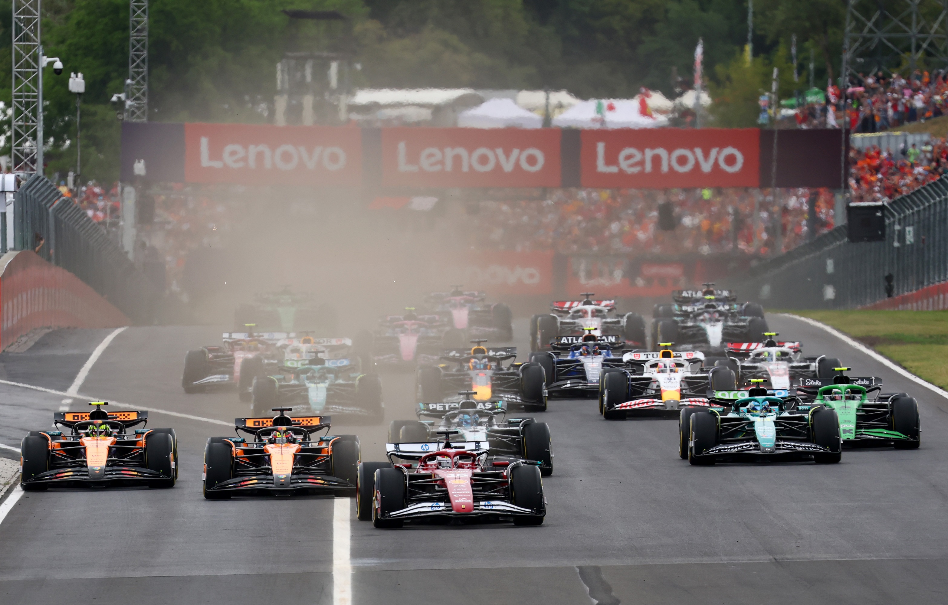 A rajt sima volt, Charles Leclerc megőrizte a vezetést a Ferrarival, őt lekövette Oscar Piastri a McLarennel, de Lando Norris a másik papaja autóban a csúcsforgalom áldozata lett: George Russell (Mercedes) és Fernando Alonso (Aston Martin) is utat talált mellette. Hamilton visszaesett két helyet.