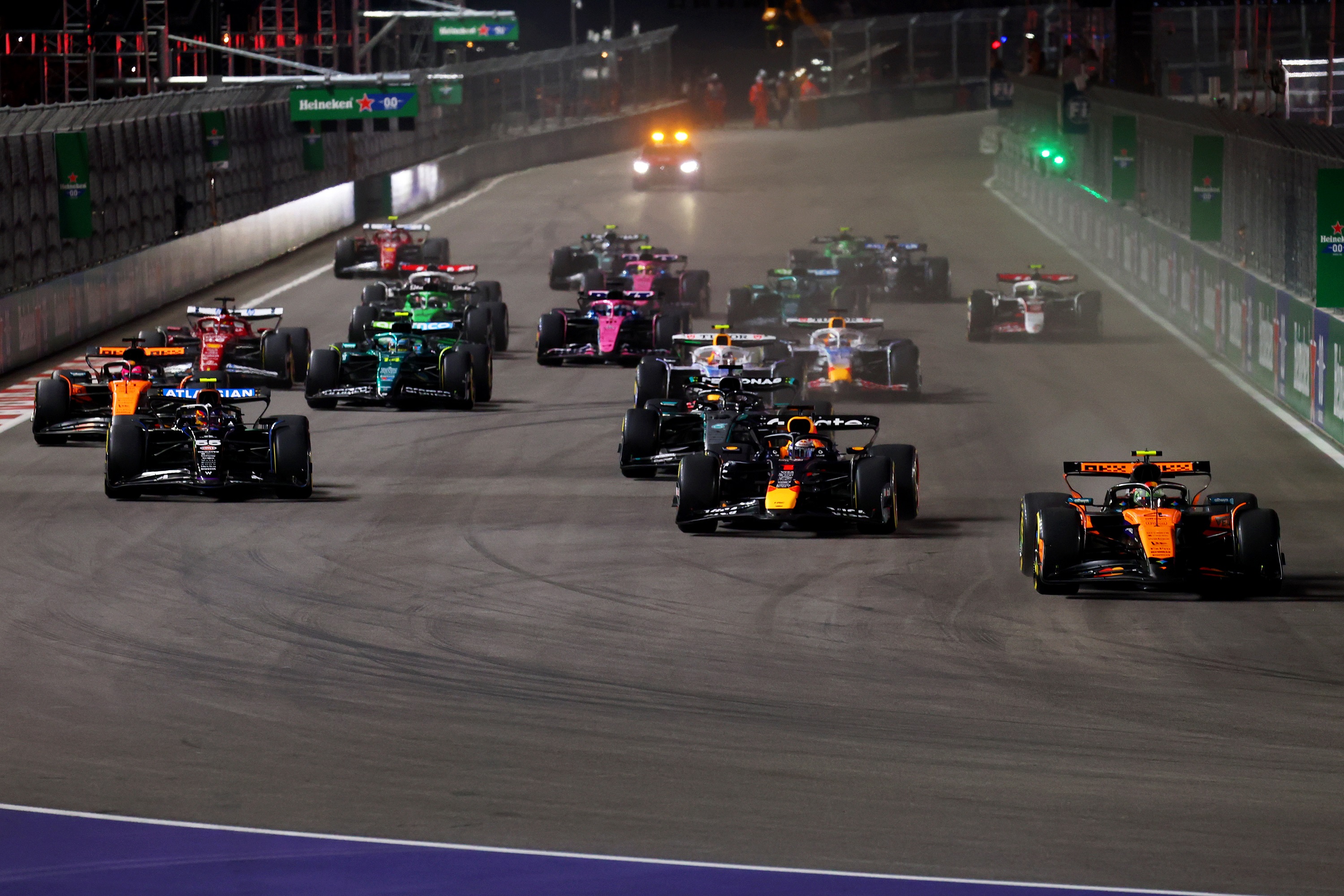 A rajt nem volt sima. az élen Lando Norris annyira erőszakosan védekezett, hogy a McLaren mellett Max Verstappen, majd George Russell is utat talált mellette a Red Bull-lal és a Mercedesszel. A mezőny végében rajtbaleset borzolta a kedélyeket, Lance Stroll nem is élte meg az első kör végét az Aston Martinnal.