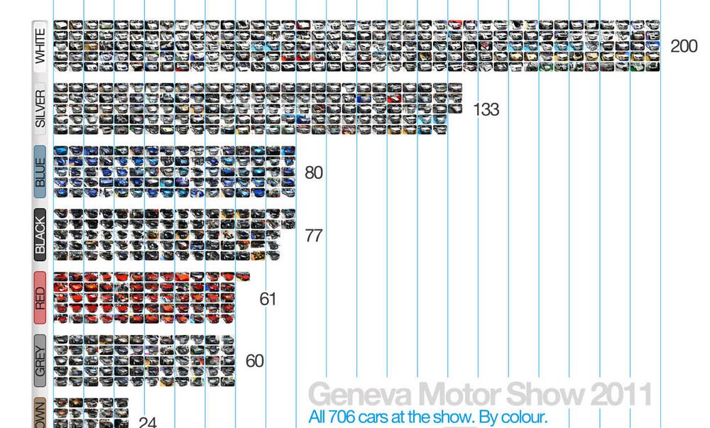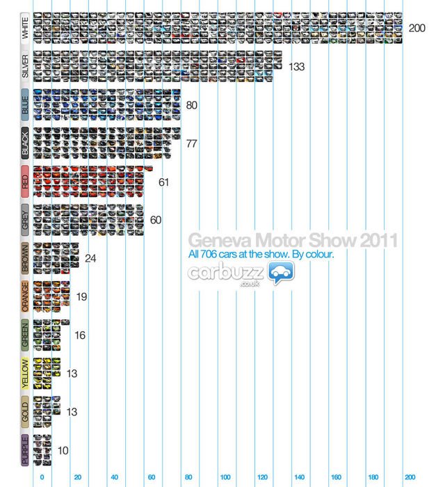 Nem sajnálták az időt és lefotózták az összes kiállított autót a Genfi Autószalonon, majd megvizsgálták, hogy milyen színűek. Kiderült, hogy a 706 kiállított autó nagy része fehér volt. Az összes autó 28 százaléka volt ilyen, de hasonlóan magas, 19 százalékos aránnyal szerepeltek az ezüstök is. Mögöttük a kék, fekete, piros és szürke modellek sorakoznak. Igazán érdekes, hogy lilából is volt tíz darab.