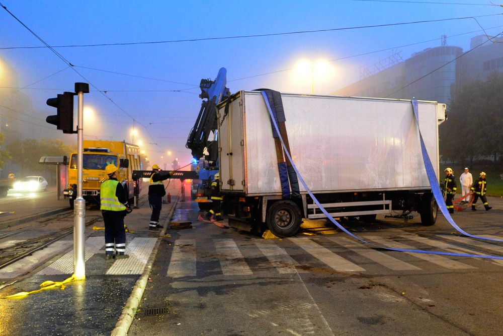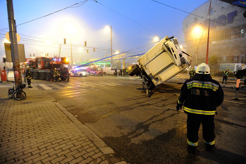 Kanyarodás közben felborult a pótkocsija egy hússzállító kamionnak a IX. kerületben, a Könyves Kálmán körút és a Mester utca kereszteződésében hétfő hajnalban. A jármű kidöntött egy jelzőlámpa-oszlopot, és az 51-es villamos forgalmát is akadályozta, egy ideig pótlóbuszok jártak.