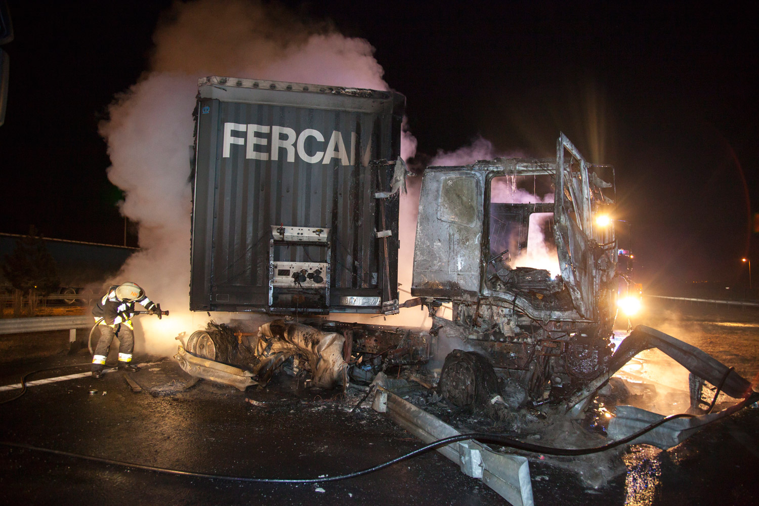 Az MTI a helyszínről úgy tudja: a magyar rendszámú, autóalkatrészeket szállító kamion megcsúszott, és keresztbe fordult az autópályán. A sztrádát teljes szélességében elfoglaló jármű rakománya és vezetőfülkéje is kiégett.