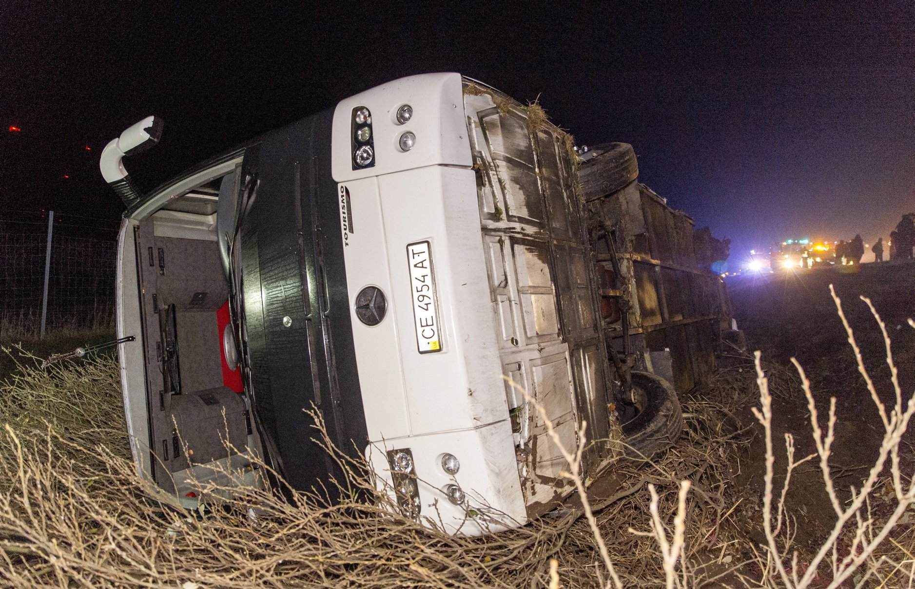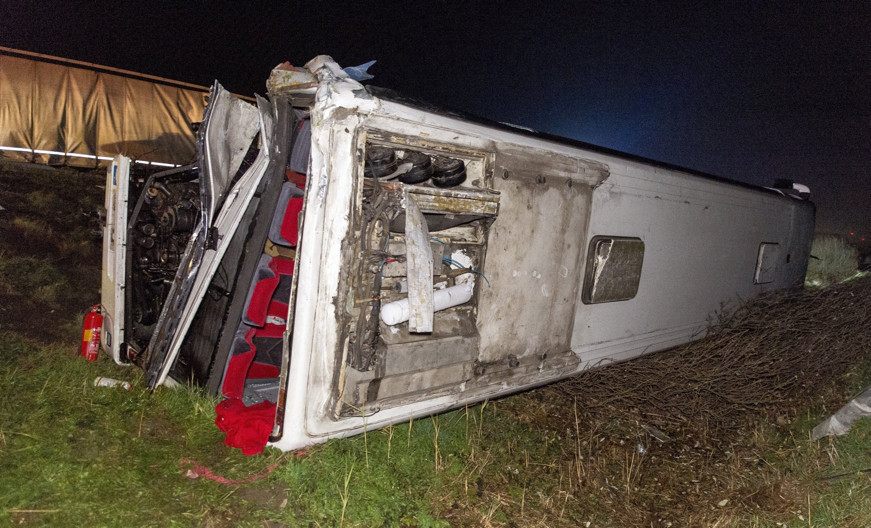 A busz az oldalára borult. A rendőrök Bábolnánál leterelik a forgalmat az autópályáról, visszahajtani Komáromnál lehet.