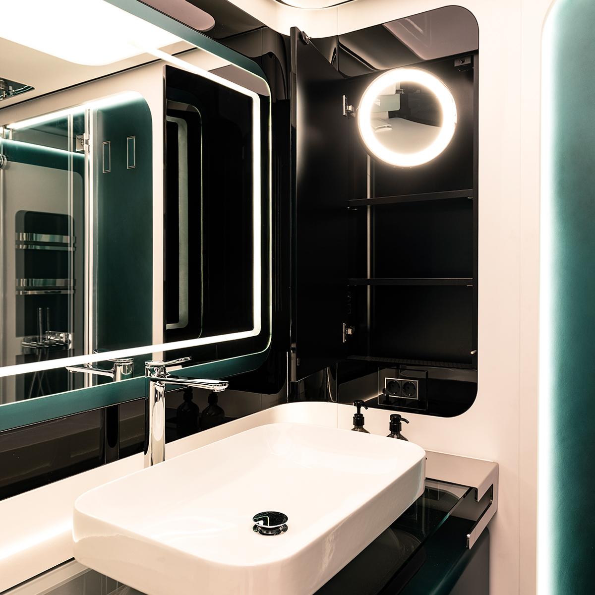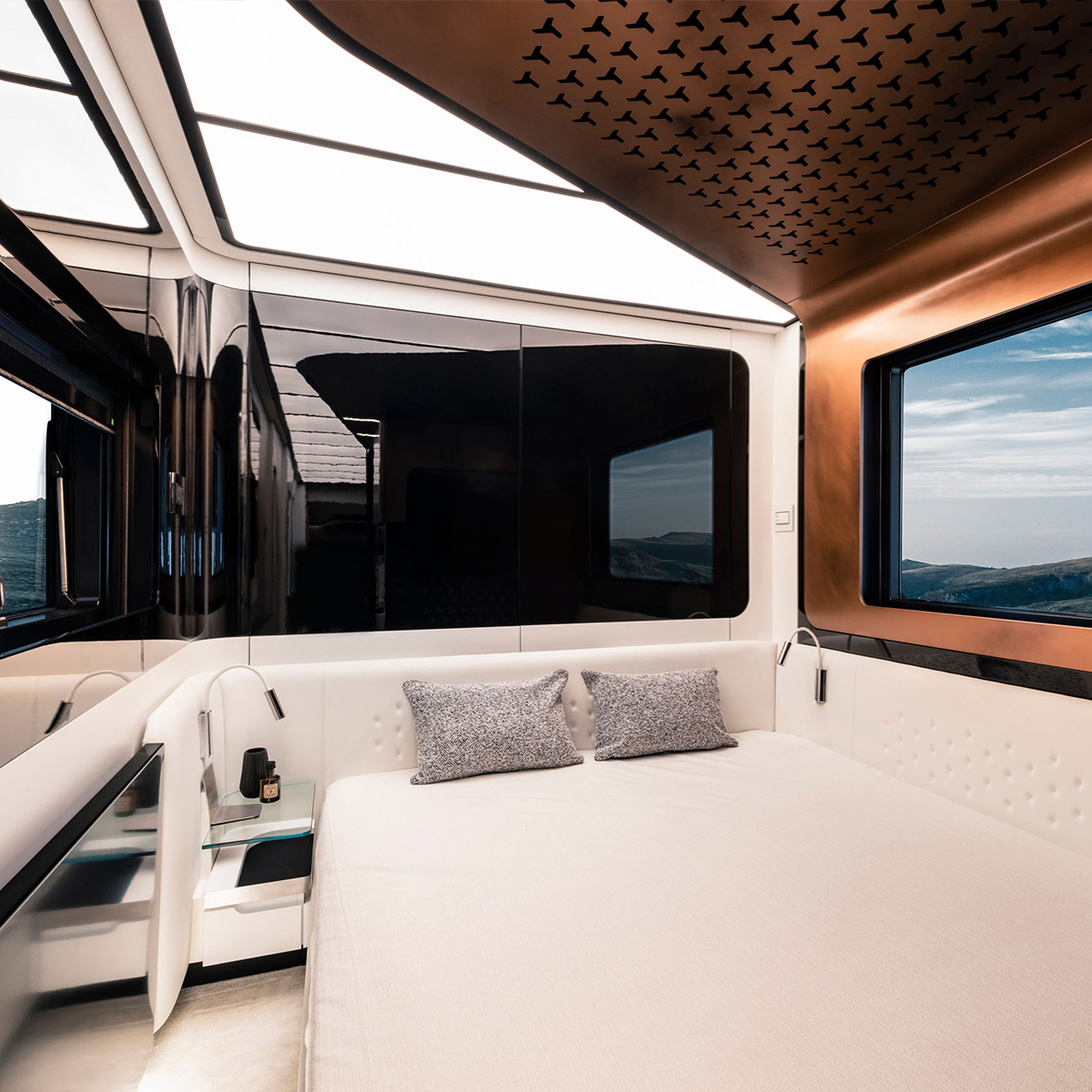 A vizesblokk a teherautó közepén kap helyet. Hátul pedig egy olyan, 2,05 méteres belmagassággal bíró hálószobát alakítanak ki, amiben 1,8 méter széles és 2 méter hosszú francia ágy áll rendelkezésre. Tévedés lenne azt gondolni, hogy a hálószoba alatt csak csomagtér van. A Dembell tervezői ugyanis rendkívül innovatív módon egy olyan 4 méter hosszú garázst alakítottak ki, amiben egy kisebb személyautó is elfér.