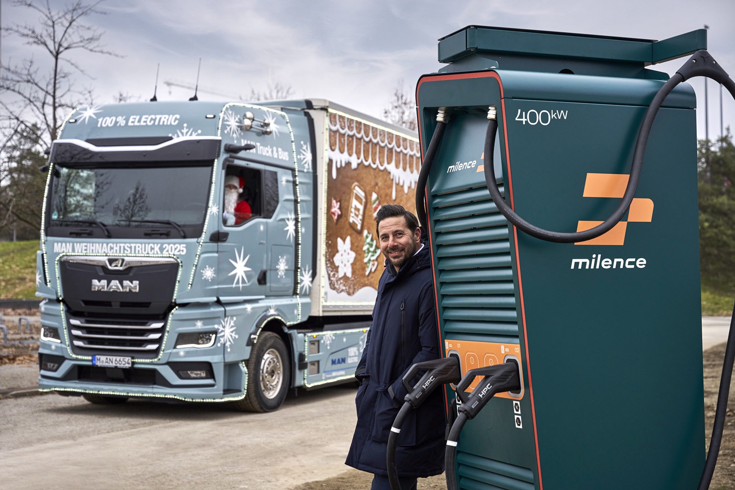 Az ünnepi kamion nemrég egy fontos feladatot teljesített. Leszállították vele az első két – egyenként 400 kW teljesítényű töltőállomást – a München északi részén található autópálya mellé, ahol egy nagyobb kamiontöltőállást terveznek felépíteni. A feladat teljesítésében az FC Bayern München legendája, Claudio Pizzaro is részt vett, aki a Bundesliga egyik legeredményesebb külföldi játékosa volt.