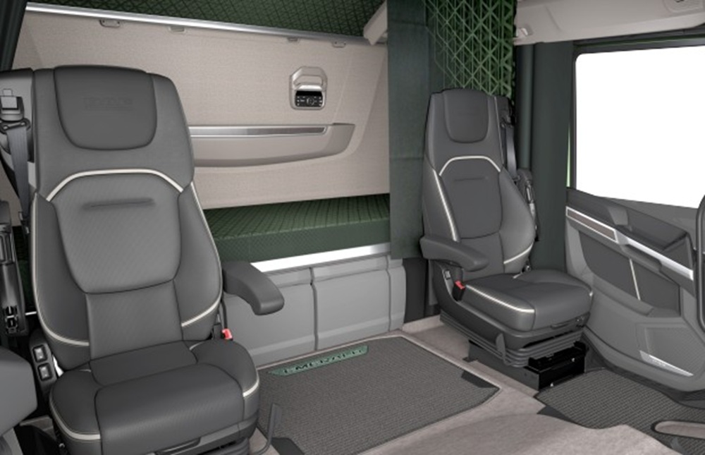 A látvány a belső terében sem fékezett habzású. A fülke gazdagon felszerelt, és a bőrkárpitozás mellett a zongoralakk hatású elemek is kiemelik a vontatót a hétköznapi munkaeszközök világából. A sofőrágy „smaragd mintás”, de hozzá illő takaró és függöny is van a kabinban. Mindezeken felül a büszke tulajdonosok még egy exkluzív csomagot is kapnak, amely tartalmaz egy színben harmonizáló paplanhuzatot, egy memóriahabos párnát, valamint egy stílusos bőr piperetáskát.