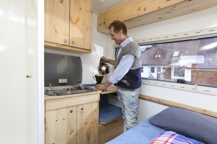 Így sikerült összehozni egy 4 köbméteres fülkét, amibe a bal oldalon elhelyezett külső ajtón keresztül lehet feljutni. Az ötletes térkihasználásnak köszönhetően a kabinban nemcsak egy hálóágynak, hanem egy minikonyhának, valamint egy zuhanykabinnal és WC-vel ellátott fürdőszobának is jutott hely. A kétégős gázfőzőlap mellé egy ülés is került, oldalsínen csúsztatható kis asztallal, így a teherautóval dolgozó gépkocsivezető kulturált körülmények között tudja elfogyasztani ebédjét, vagy vacsoráját.