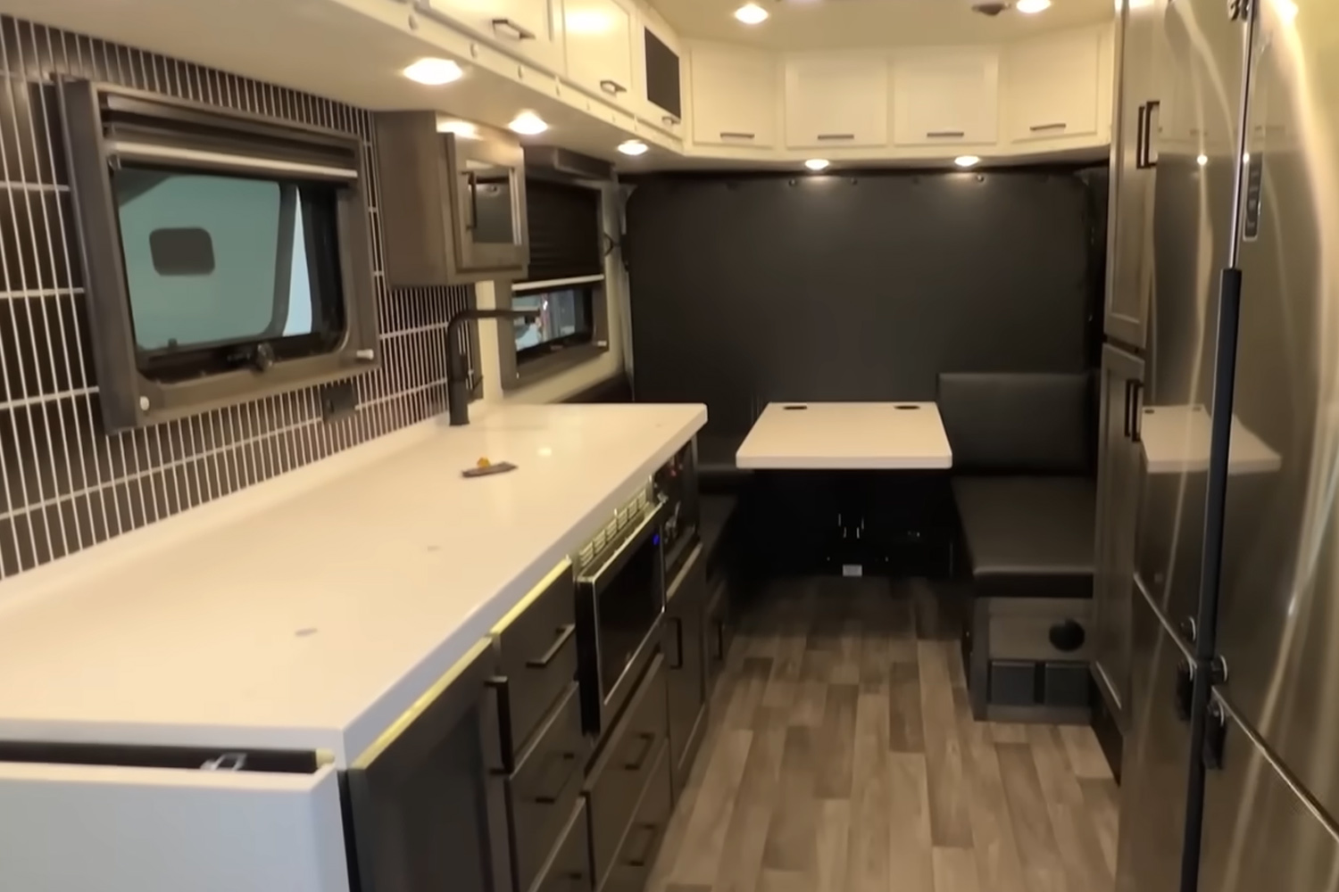A sofőr mögött komplett zuhanyzó kapott helyet, WC-vel kiegészítve. Aztán ott a konyha, majd a nappali, ebédlőasztallal, sarokülővel, ami pillanatok alatt átalakítható kétszemélyes franciaággyá. Nem szükségmegoldásról van szó, hanem valódi, többfunkciós térről, ahol enni, dolgozni vagy pihenni lehet. Van mosogató, főzőlap, mikrohullámú sütő és egy teljes méretű hűtő is. Ez már az a szint, ahol nem konzerveken él a sofőr, hanem süt-főz magának, otthoni körülmények között.