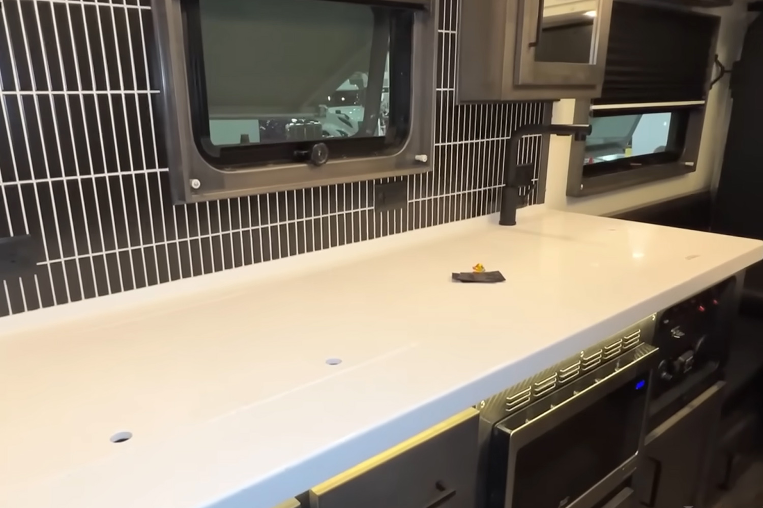A cserélhető matracos ágy felett szekrények és rengeteg rejtett tároló biztosítja, hogy akár hetekig úton lehessen lenni. A szórakozásról okostévé és hangrendszer gondoskodik.
