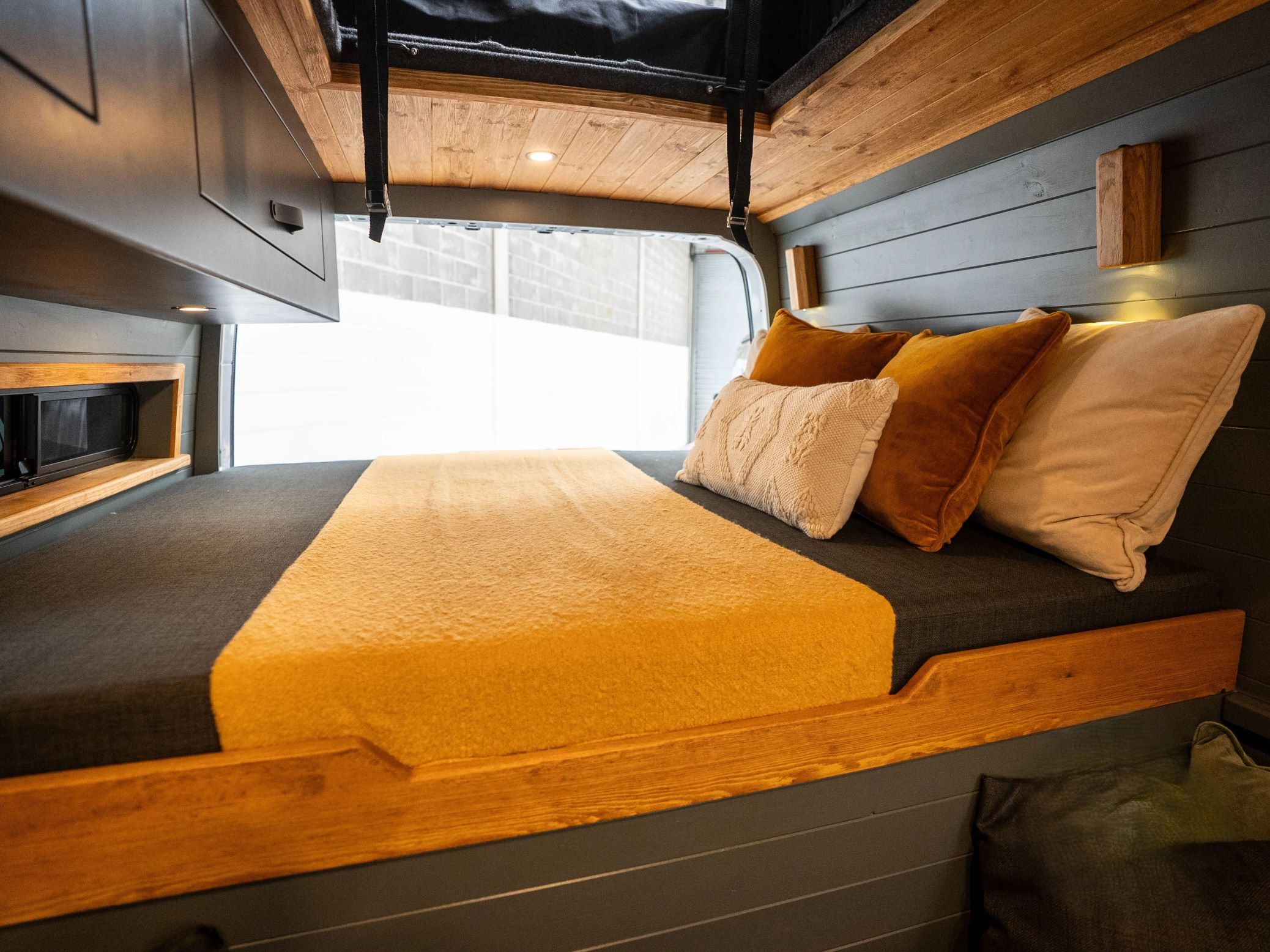 Rögtön mellette találjuk a mini konyhát, amiben egy kétégős főzőlap, hűtőszekrény, valamint kihúzható tároló fiókók állnak rendelkezésre. Az elkészített fogásokat egy hangulatos, kétfős asztalnál lehet elfogyasztani, de akár fő is elfér kényelmesen a furgonban. A tetőn ugyanis egy pop-up hálóágy található, de van egy kétszemélyes ágy a hátsó traktusban is. Ez alatt pedig egy nagyobb csomagtér várja a rakományokat, így játszi könnyedséggel rejthetjük el például a rollereket, vagy összecsukható kemping bicikliket. Sőt, akár a sátrak, vagy kisállat hordozó eszközök is elférnek a franciaágy alatt.