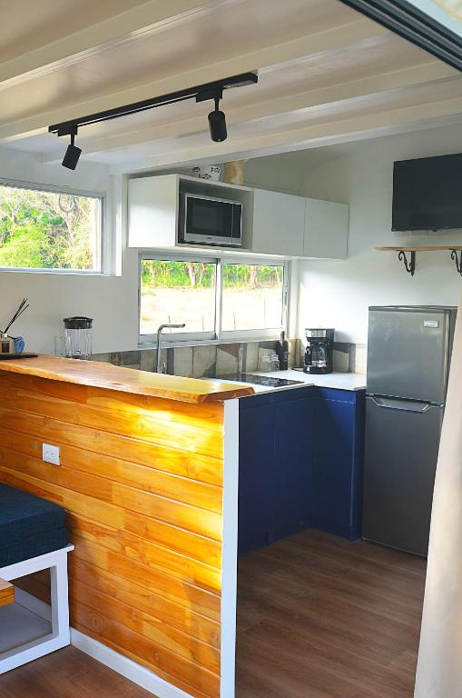A Thomas Built buszból kialakított buszhotelben minden megvan, amire csak szükség lehet. Nem kell az időjárás viszontagságaitól tartani. A hotelbe a fedett teraszról lehet belépni. A látogatót egy amerikai konyha fogadja, amelyben minden szükséges háztartási gép (hűtő, mikrohullámú sütő, főzőlap, kávéfőző) rendelkezésre áll ahhoz, hogy több napot lehessen eltölteni a “fedélzeten”. A konyha mellett egy zuhanyzóval, mosdókagylóval, valamint angol vécével felszerelt fürdőszoba kapott helyet.