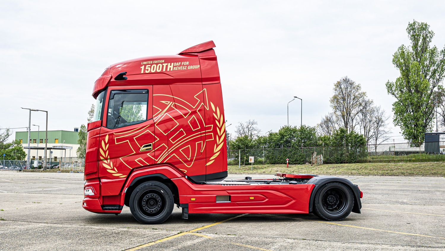 Az újdonság a mérföldkőhöz mérten beszédes rendszámot kapott: a piros DAF-ra az RV-SZ-1500-as feliratú plakett került, ami így közvetlen utalást jelent arra, hogy immáron az 1500. DAF vontató került a Révész Csoporthoz.