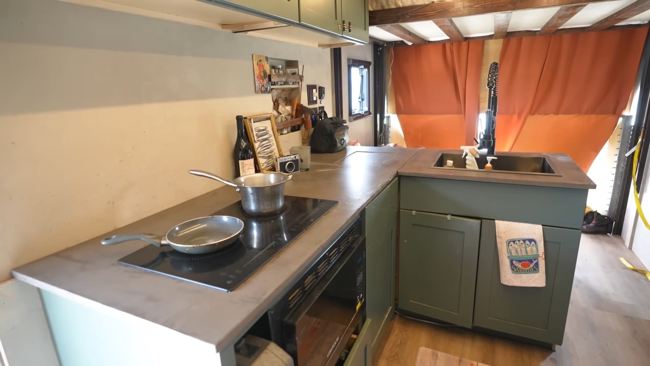 Az ajtóval szemben rögtön egy zuhanyzó található, mellette pedig egy tágas, jól felszerelt konyha kapott helyet. Ezen a részen indukciós főzőlap, mikrohullámú sütő, mosogató és egy tűzhely is rendelkezésre áll. Amikor valaki a konyha közepén áll, olyan érzése lehet, mintha nem is egy teherautóban, hanem egy vidéki nyaraló konyhájában lenne. Erre ráerősítenek a sötétzöld szekrény ajtók és a természetes fából készült munkalapok.