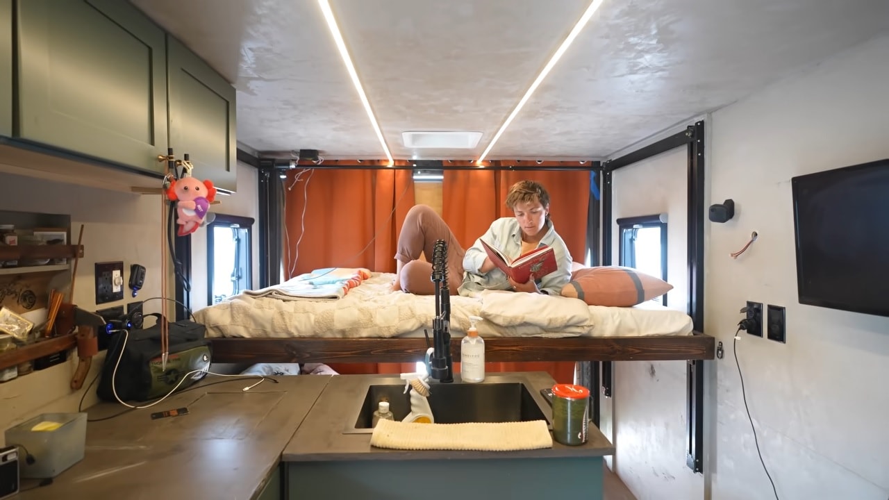 Természetesen akkor sincs baj, ha kint rossz az idő. A lakórész falán egy síkképernyős televízió is megtalálható, amelyet akár a konyhából, akár az ágyról is lehet nézni. Bent kellő számú aljzat áll rendelkezésre, így ha Morgannek szüksége van az elektromos kütyüinek töltésére, gond nélkül megteheti. A hölgy tehát kifejezetten otthonos lakóteherautót varázsolt egy eredetileg áruszállításra szánt haszongépjárműből. Mivel a külsőt nem igazán változtatta meg, simán lehet, hogy időnként elkérik tőle a fuvarlevelet, amikor a kormány mögött ül.