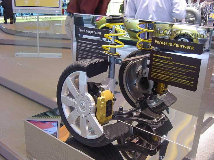 A megfelelő agilitás érdekében egy új, jóval feszesebb futóművet terveztek a sportváltozathoz, ami alacsonyabbra is engedi a karosszériát. A stabil útfogásban szerepet játszik az is, hogy az autót 18 colos felnikkel és igen peres, 225/40-es gumikkal szerelik. Megfelelő fékkel is felvértezték a sportos Mégane-t, elöl 312, hátul 300 milliméteres, belső hűtésű tárcsafékek és négydugattyús féknyergek lassítják az autót.