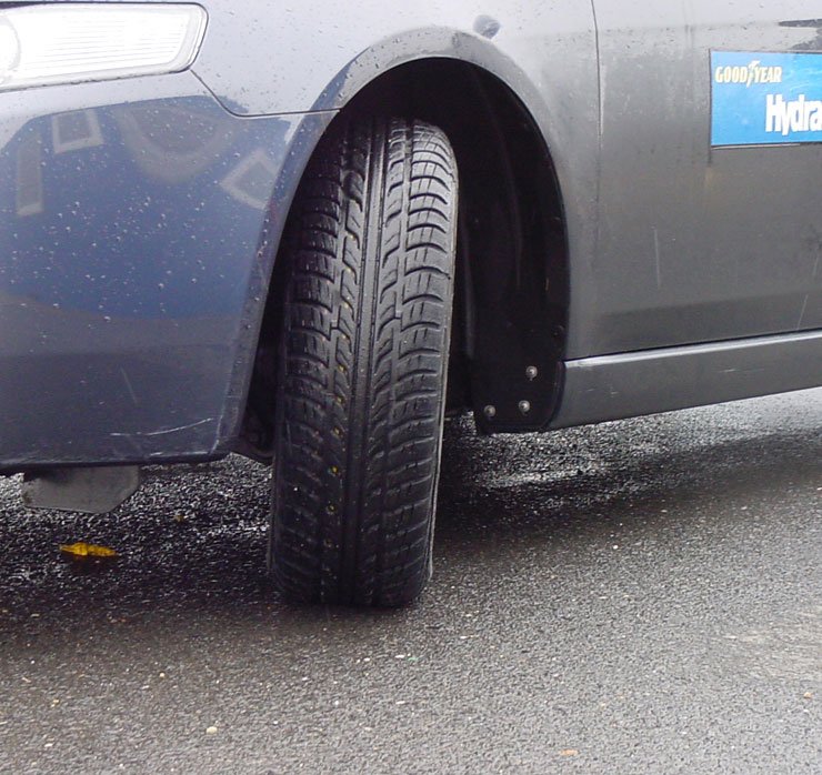 Vezetés közben az újonnan kifejlesztett összetételű gumikeverékből, a tapadást javító szálkákból, a sziszifuszi munkával elhelyezett és tökéletesített esőcsatornák számából és a jellegzetesen goodyear-es mintázatból csak annyit érezni, hogy az autó nagyon jól tapad.