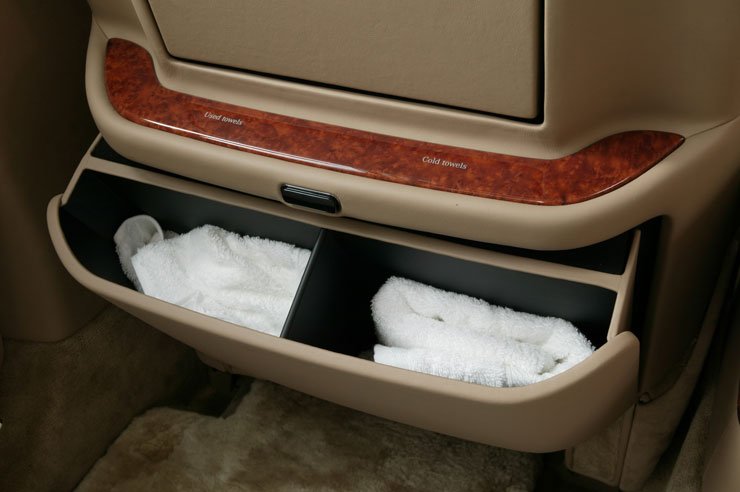 Az első ülések hátuljáról egy praktikus asztalka hajtható le, a hátsó középkonzolon pedig egy hagyományosnak tűnő vezetékes telefon kapott helyet. Egy hotelben természetesen nagy figyelmet kell fordítani a csomagokra, így különleges borítást kapott a csomagtartó is.