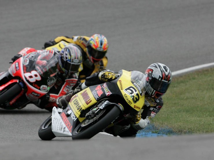 A kiélezett küzdelmet mutatja, hogy az Apriliával versenyző Marco Simoncelli a kilencedik helyről is az élre tudott kerülni.