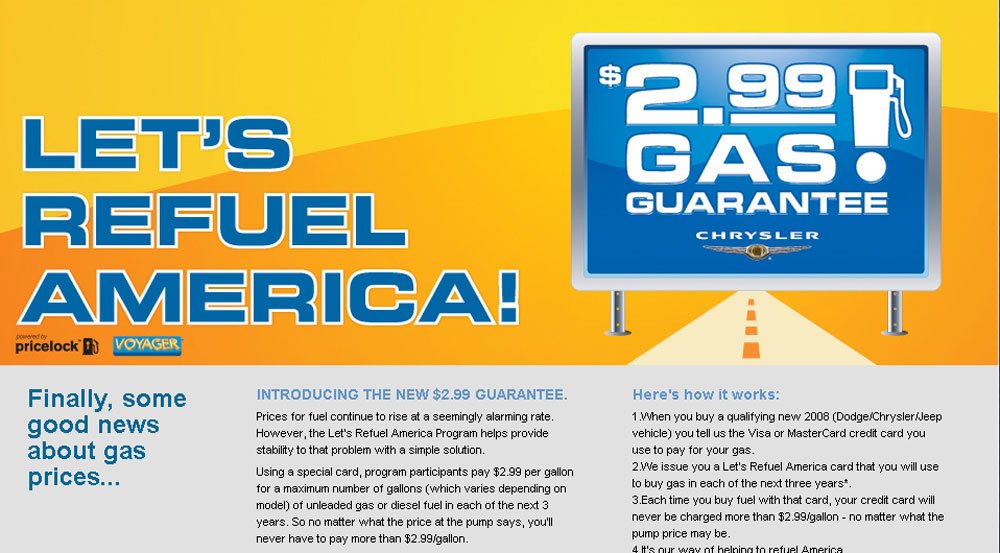 Nem mindegyik modellre vonatkozik az akció, de számos Chrysler, Dodge és Jeep-típus szerepel a promócióban, amelyhez komoly reklámkampányt is tervez a cég. Számítások szerint a vevők így maximum 3000 dollárt, körülbelül félmillió forintot takaríthatnak meg, de ehhez 50 forintnak megfelelő áremelkedésre lenne szükség, 15 literes fogyasztással és átlagos használat mellett.