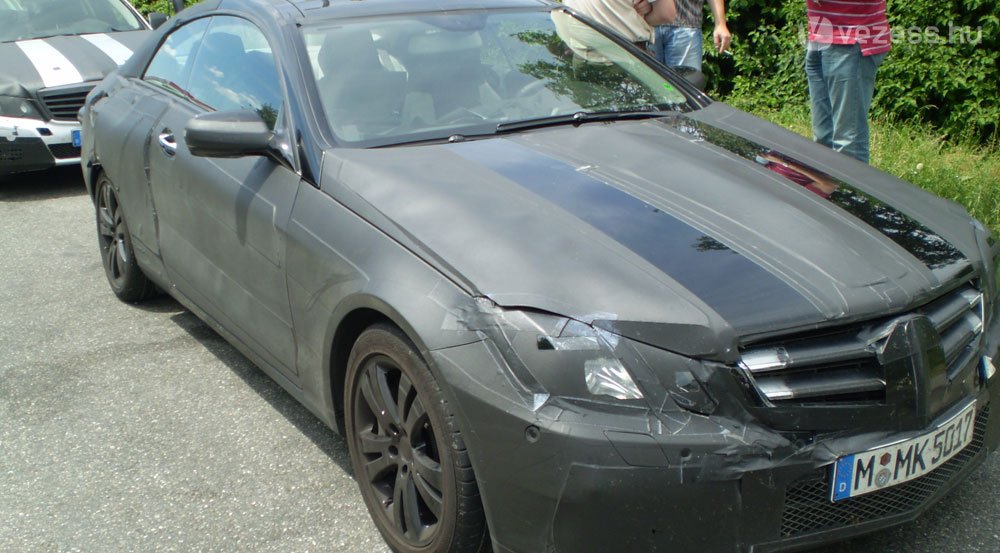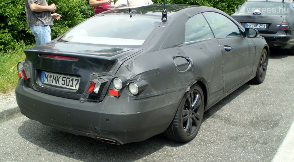 “A gyári tesztcsapat egy rövid ideig leparkolt, akkor készültek a képek. Persze nem ment simán, mert eleinte ellenkeztek, de sikerült rábeszélnem őket erre a pár képre. Elöl egy mikrobusz, majd két új E-osztály állt, közöttük pedig egy kupé, amelyről annyi felvilágosítást adtak, hogy egy “top secret” modell.  Az eleje egy kicsit hasonlít az E osztályra, a teteje valószínűleg nyitható fémtető (mi valószínűbbnek tartjuk, hogy ez a kupé és nyitható üvegtetőt kap – szerk.), a fara pedig felismerhetetlen, mert a “B” oszloptól hátrafelé egy nagy plasztik elem volt az autóra toldva.