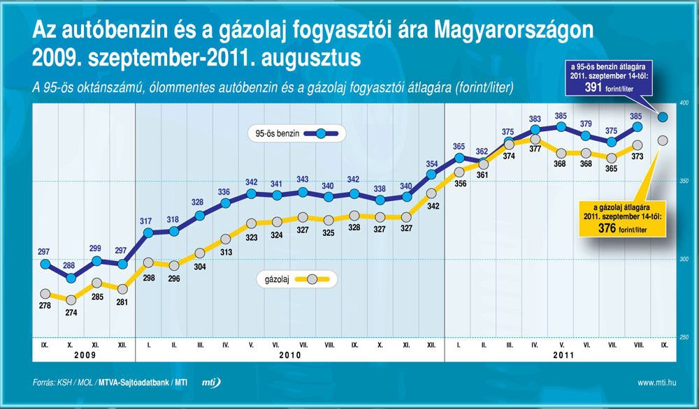 Legutóbb, egy hete bruttó 7, illetve 5 forinttal emelte a Mol Nyrt. a 95-ös benzin és a gázolaj nagykereskedelmi árát. Idén összesen 29 forinttal nőtt a benzin, és 25 forinttal emelkedett a gázolaj ára a hazai töltőállomásokon.