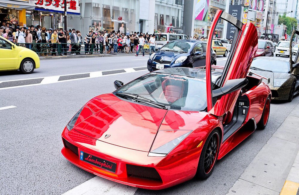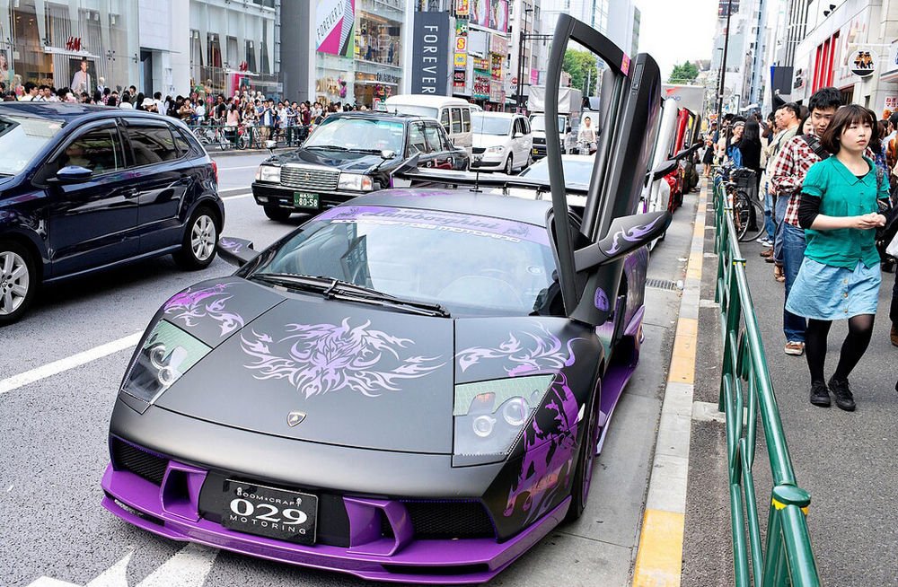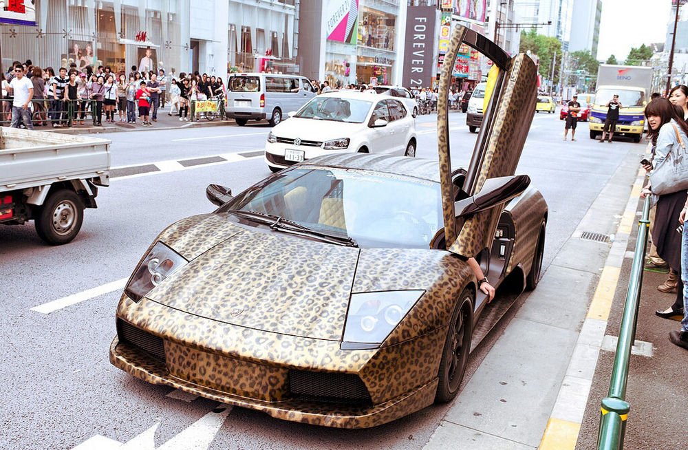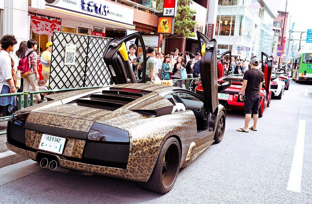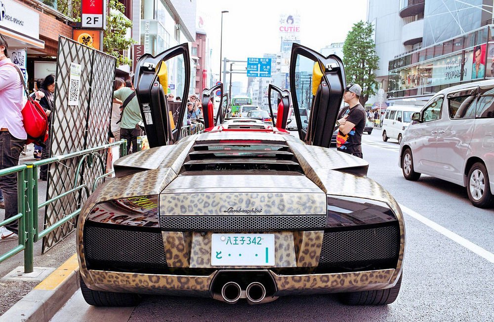 Olasz bika leopárdmintával? Japánban még ez is lehetséges. Tokióban tűnt fel négy különleges Lamborghini Murcielago, ezek között állt ez az igazán feltűnő kivitel. Társaival ellentétben a karosszériához nem is nyúltak, legalábbis a formájához, ám a színe …megdöbbentő!