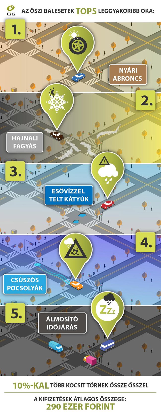 A CIG Pannónia biztosító felmérése szerint ősszel tíz százalékkal emelkedik az autóbalesetek száma, de az átlagos kárérték nagyjából változatlan, 290 ezer forintos. A novemberig tartó időszakban balesetek főleg azért történnek, mert sokan nem cserélik le időben a nyári gumikat, nem készülnek fel az őszi esős, hajnalban már fagyos időjárásra. Sokakat váratlanul ér, hogy ősszel megnő a nappali-éjszakai hőmérsékletingadozás, a nappali meleg ellenére is lefagyhatnak hajnalra az utak.