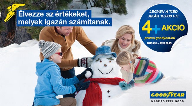 1. A vásárló (2013. október 1. és december 15. között) 4 darabos készletet vásárol az akcióban részt vevő Goodyear abroncsokból. Az akcióban részt vevő termékek és kereskedők listája a promo.goodyear.hu. oldalon olvasható.