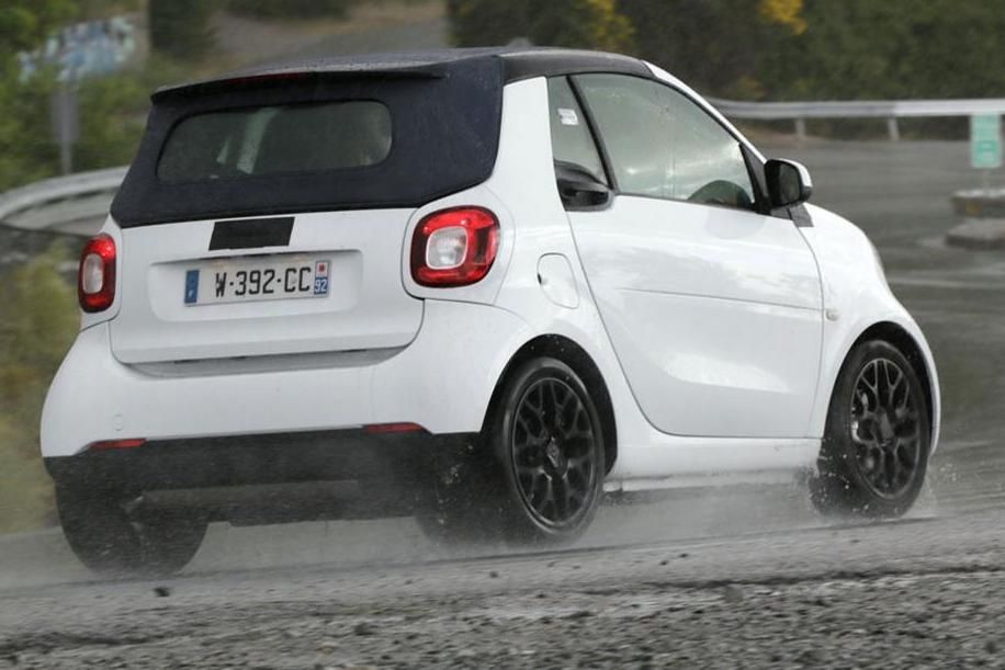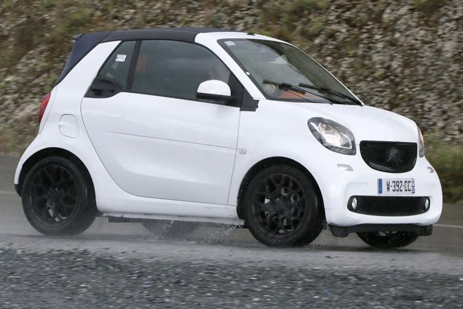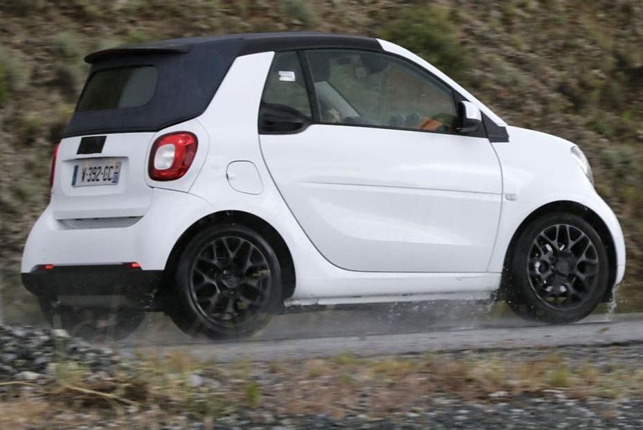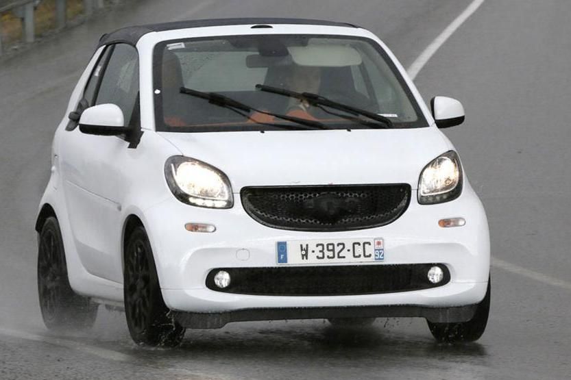 Az időjárás nem volt kegyes a kémfotósokhoz: a Smart Fortwo kabrió prototípusán végig zárva maradt a vászontető az esőben. Nem mintha arra számítanánk, hogy változott a koncepció: a vászontetőt motor húzza hátra, egészen a hátsó szélvédő tetejéig; az ablak kiemelhető lesz a helyéről.
