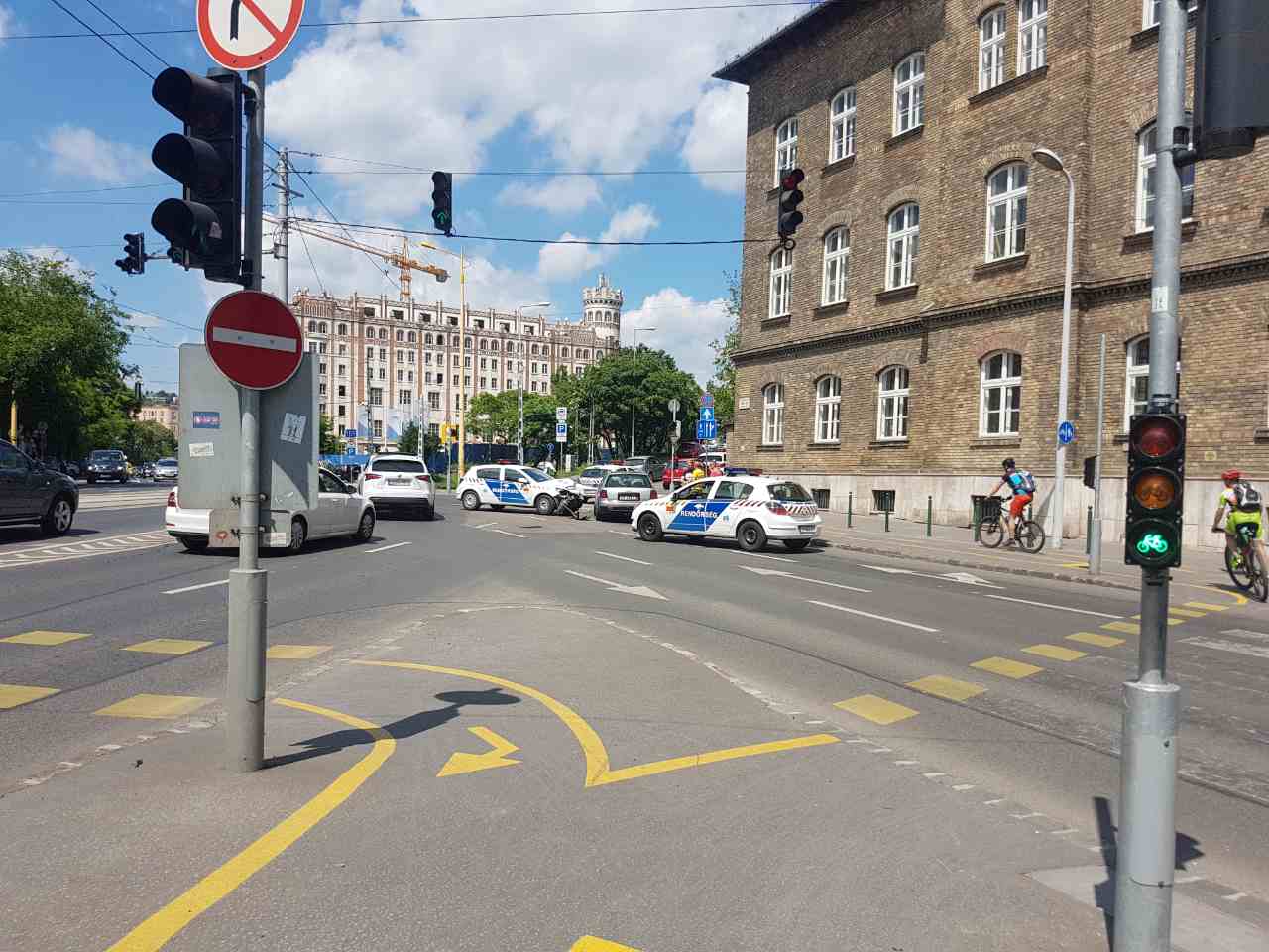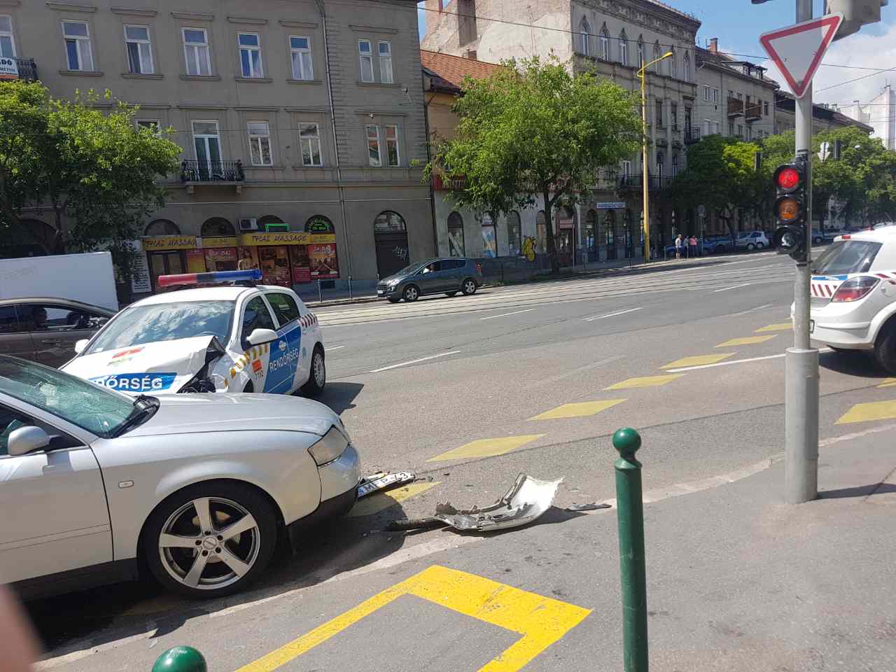 Eddig ismeretlen okokból ütközött össze egy Audi A6 Avant típusú személygépkocsi és egy Opel Astra rendőrautó Budapesten az Attila út és a Vérmező út kereszteződésében. A baleset során személyi sérülés nem történt.