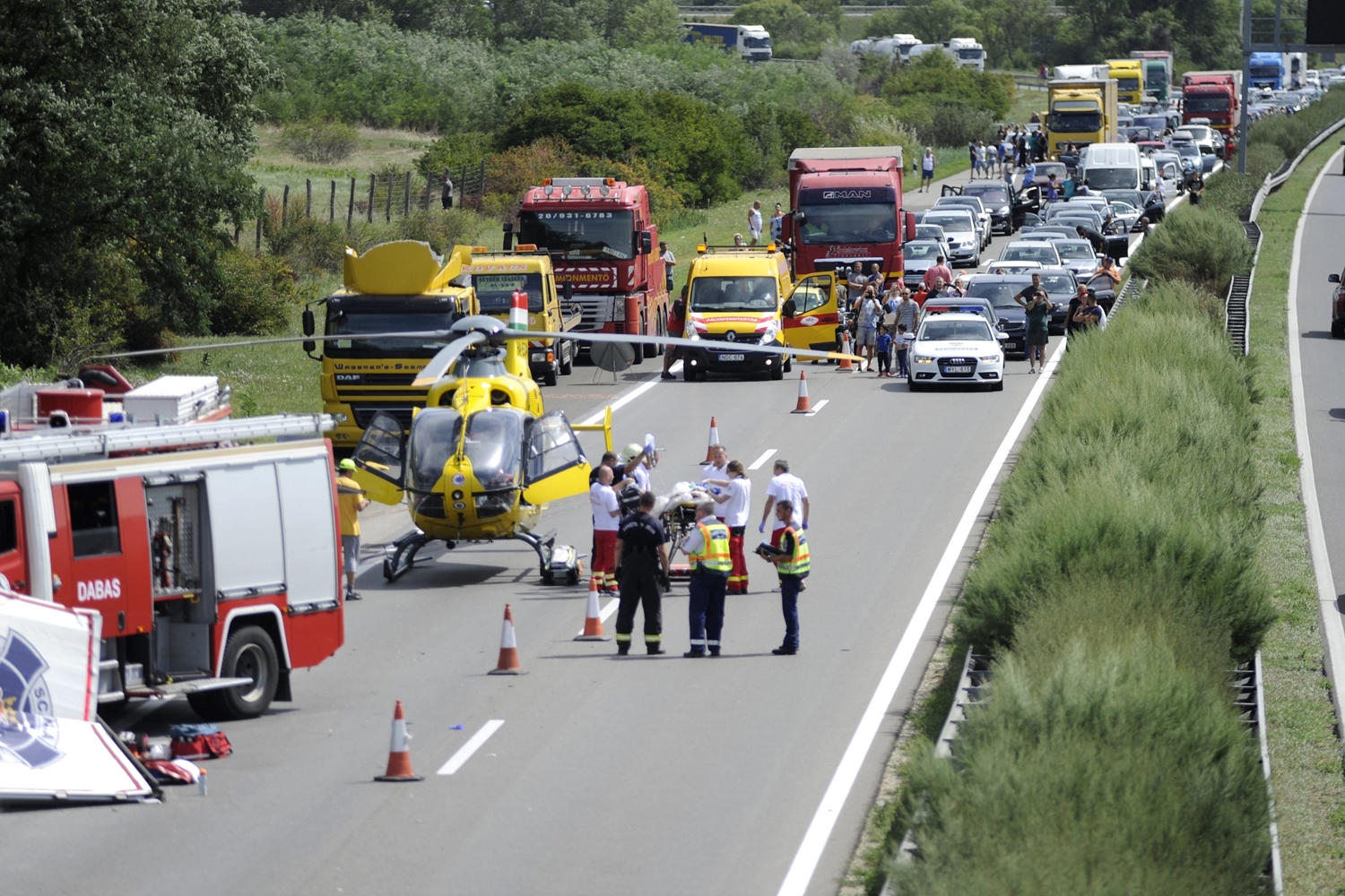 Külföldi rendszámú teherautó rohant bele a leállósávban veszteglő kamionba. Az ütközés során a teherautót vezető férfi súlyosan megsérült, a helyszínre mentőhelikoptert is hívtak.