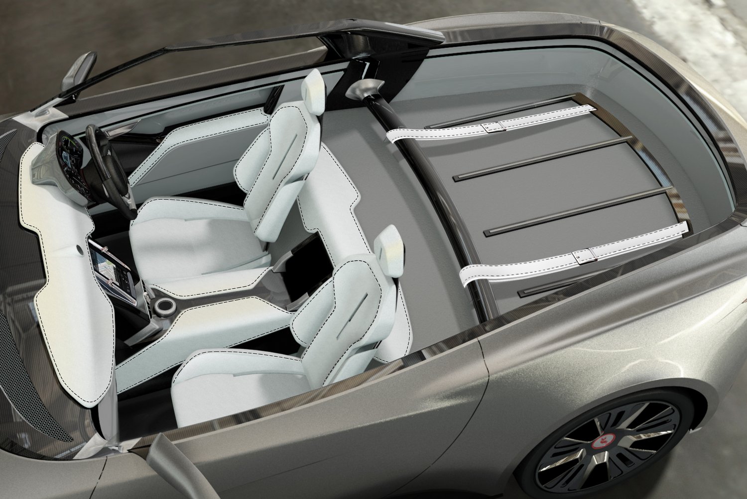 A tetőkeret és a B-oszlop fedetlenül hagyott karbon szerkezete arra enged következtetni, hogy az egész váz ebből a könnyű, merev és drága anyagból készülhet. Hátul napelemeket vélünk felfedezni, de lehet, hogy csak a grafikus tréfált meg bennünket – jelenleg ugyanis az autó még nem létezik. Hogy ezen változtassanak, közösségi finanszírozási kampányt indítottak, ahol bárki hozzájárulhat a nagy álom megvalósításához.
