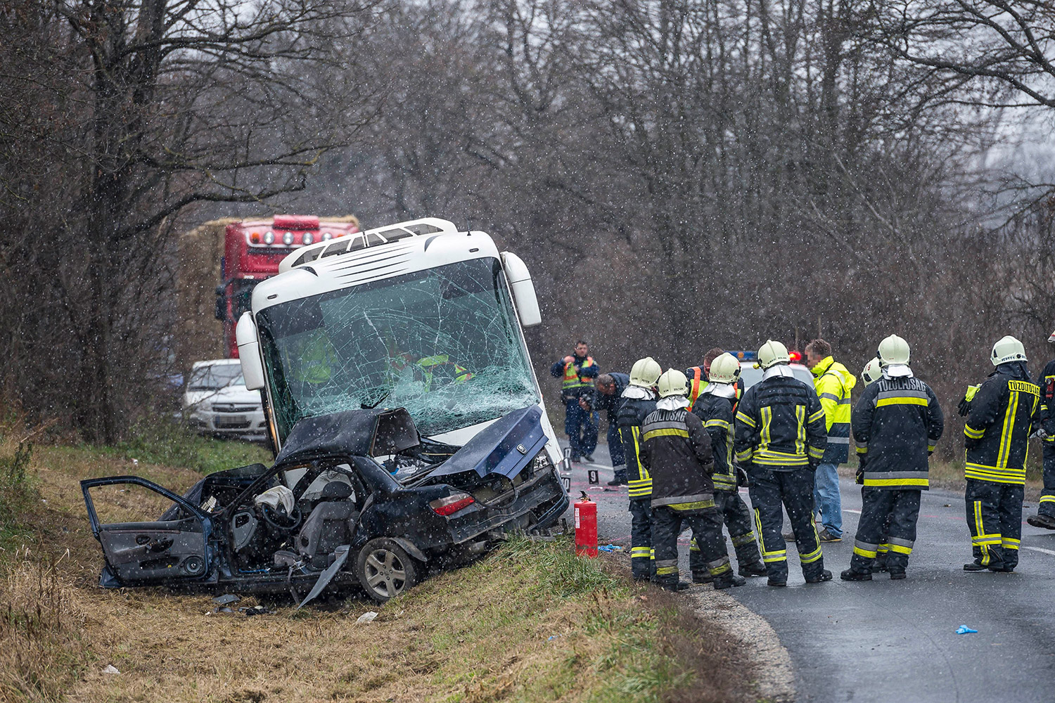 A személygépkocsi vezetője a helyszínen meghalt. A buszon huszonöten utaztak, közülük az első információk szerint ketten sérültek meg könnyebben.