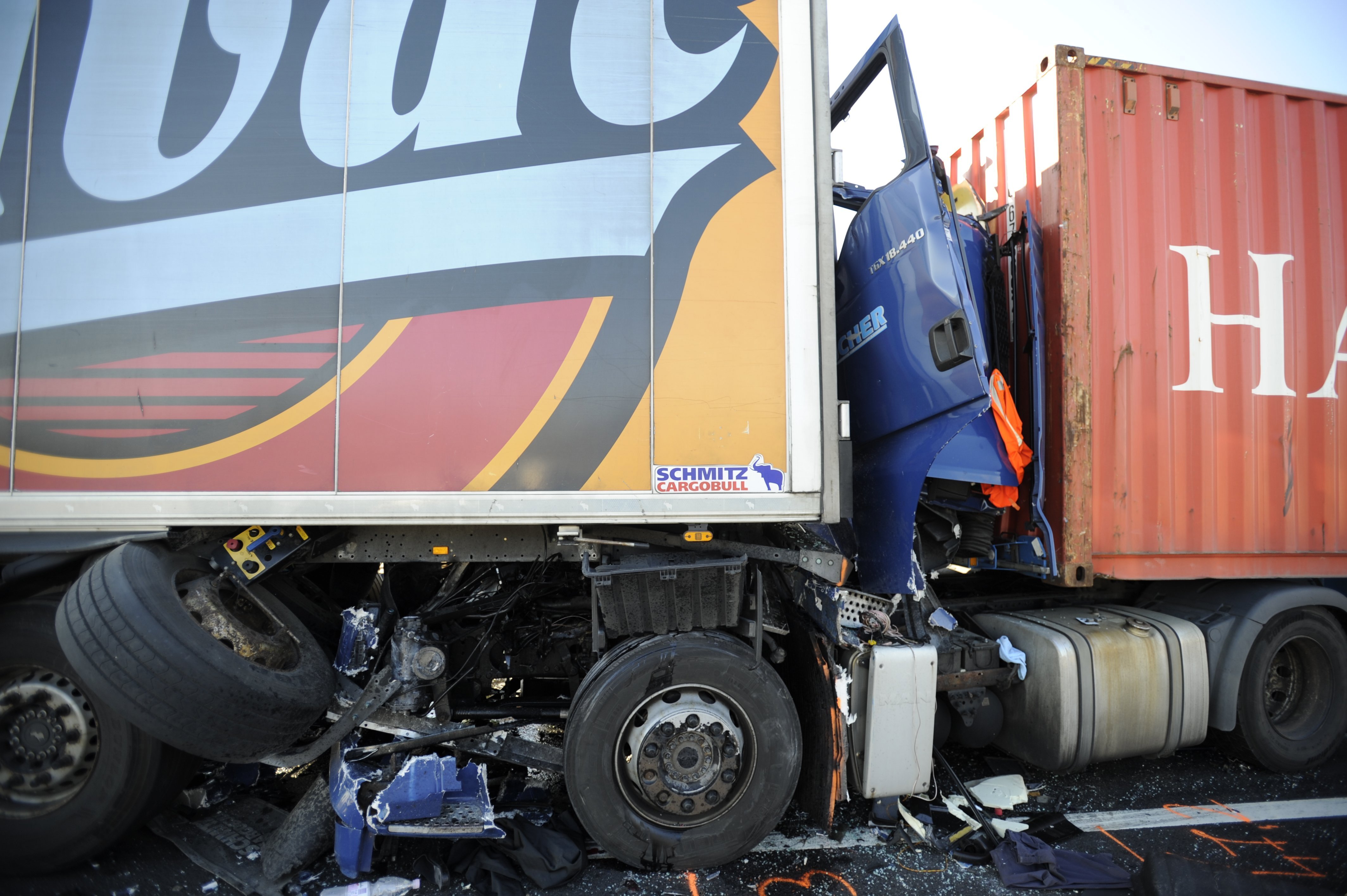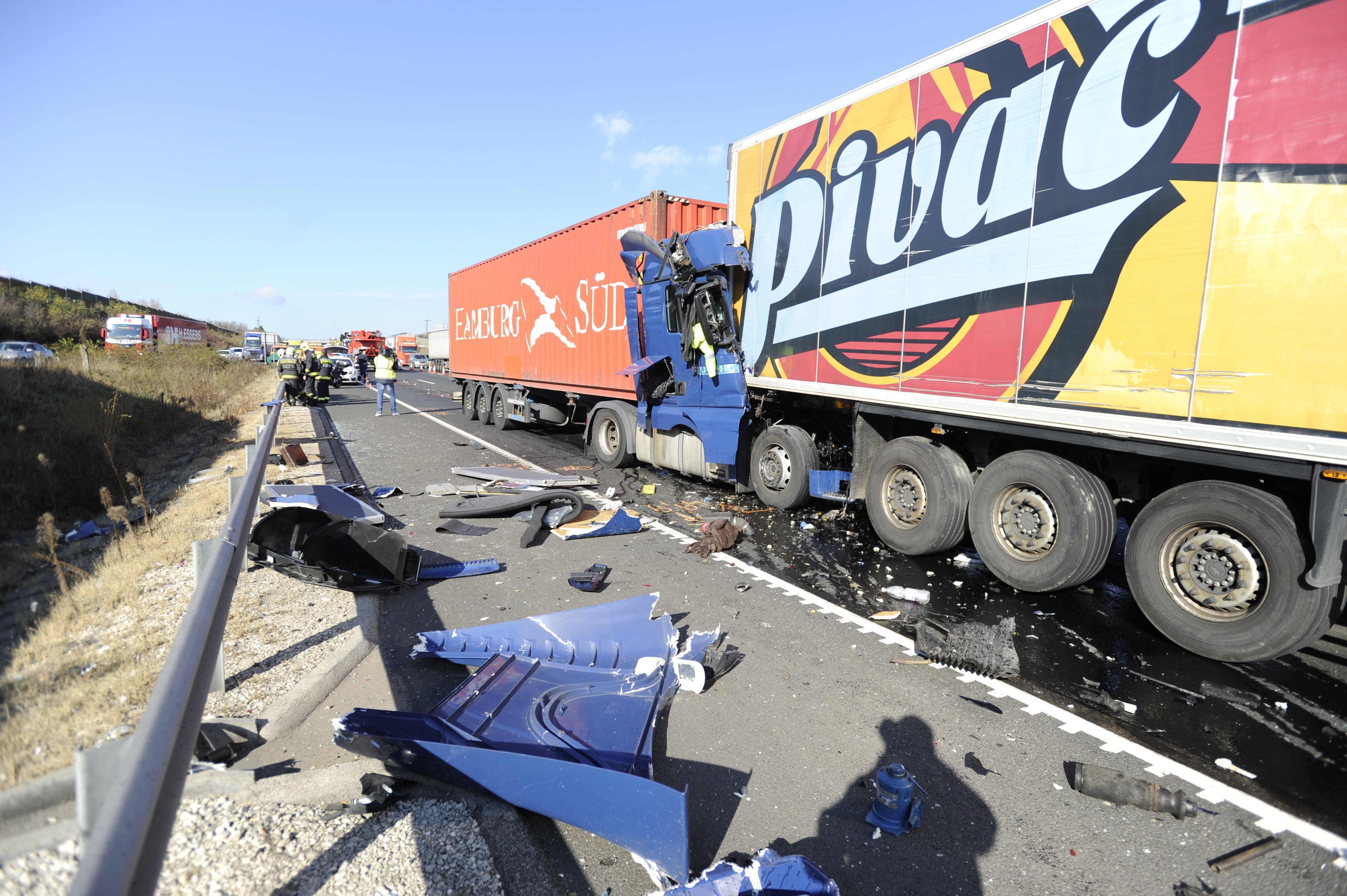 Három kamion ütközött össze, az egyik jármű annyira összeroncsolódott, hogy vezetője a fülkébe szorult, ő a helyszínen meghalt.